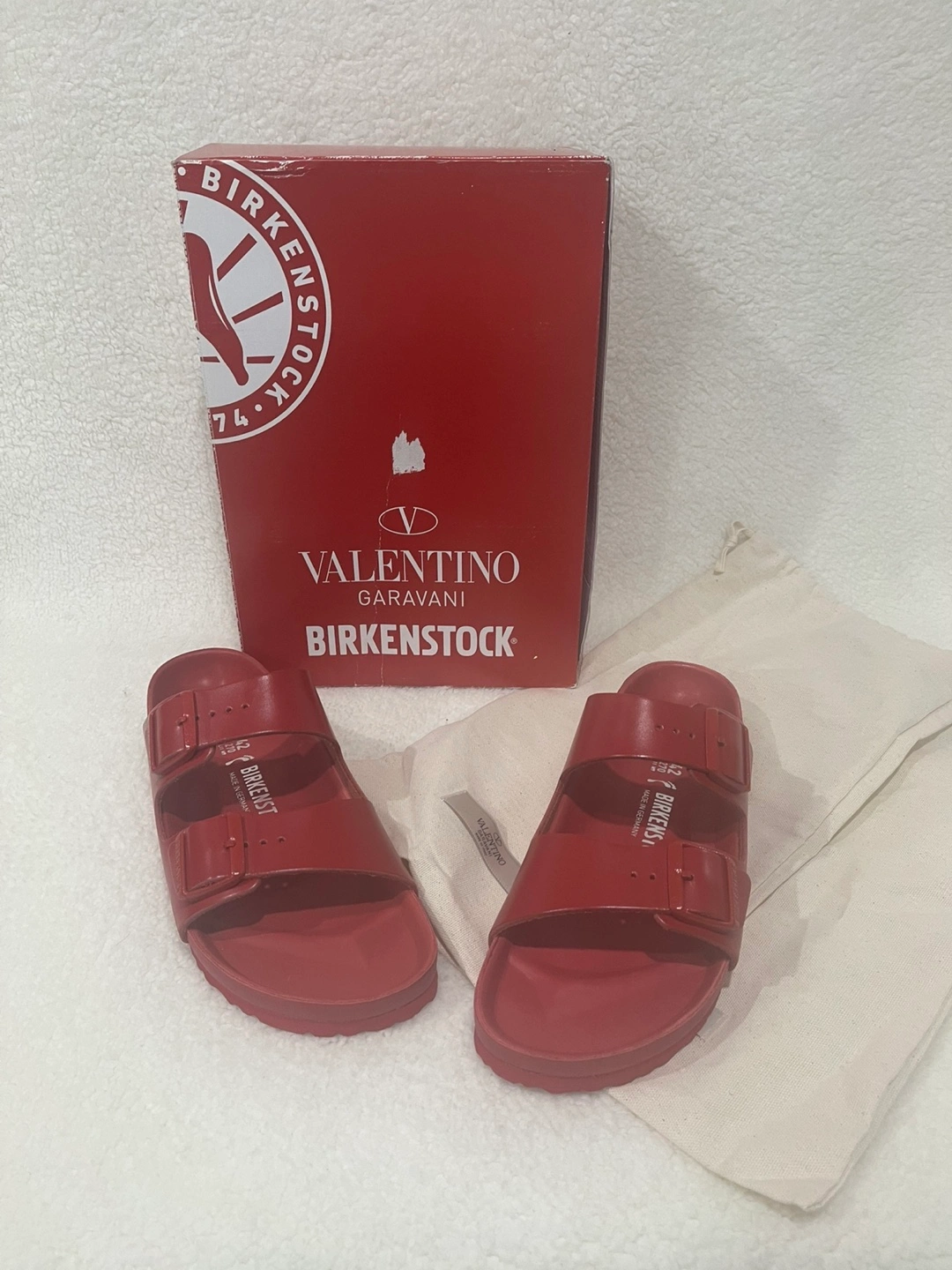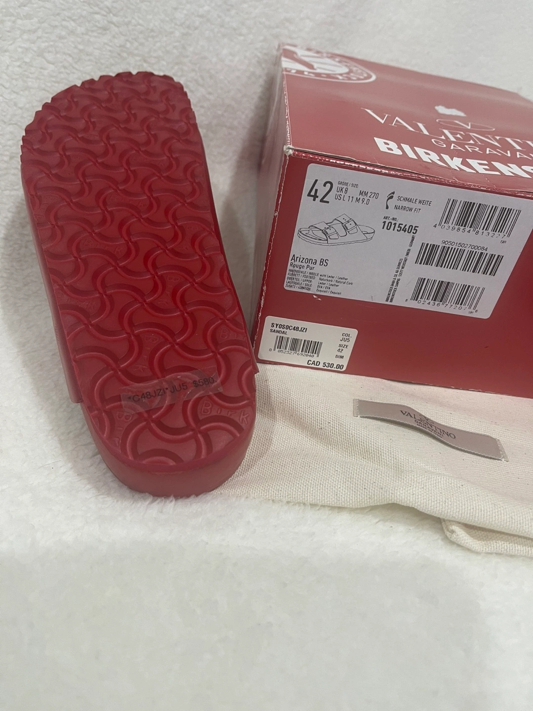 262Selling a pair of Valentino Garavani Birkenstock Arizona sandals in size 42 , US size 9 men’s; size 11 ladies, narrow fitting . They are in great condition and come with the original box and dust bag. The box indicates a price of CAD $530.00 the shoe has a sticker of CAD $580