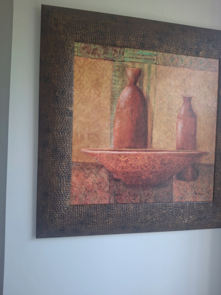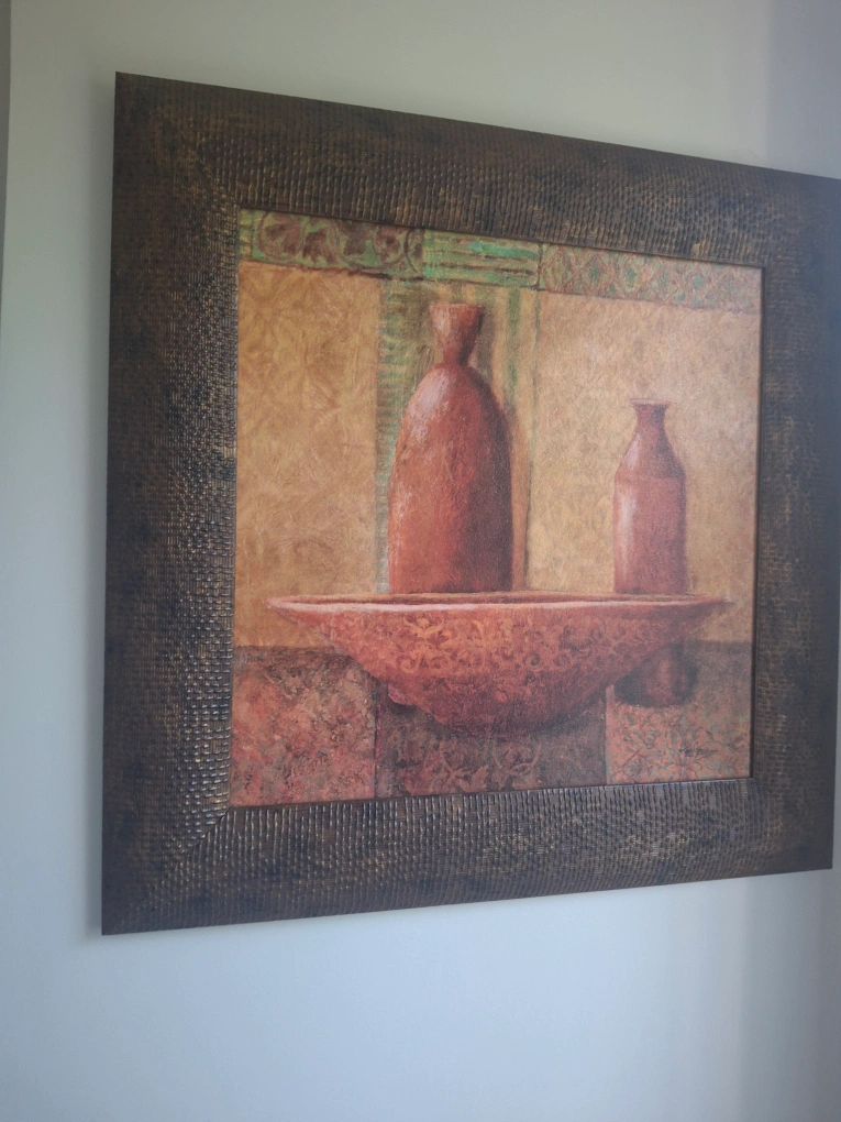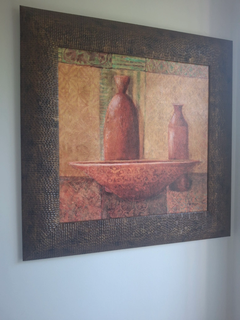 A framed still life painting featuring a bowl and two vases. The frame has a textured, woven look. The colours are warm and earthy, with shades of brown and terracotta. It would look great in any room!