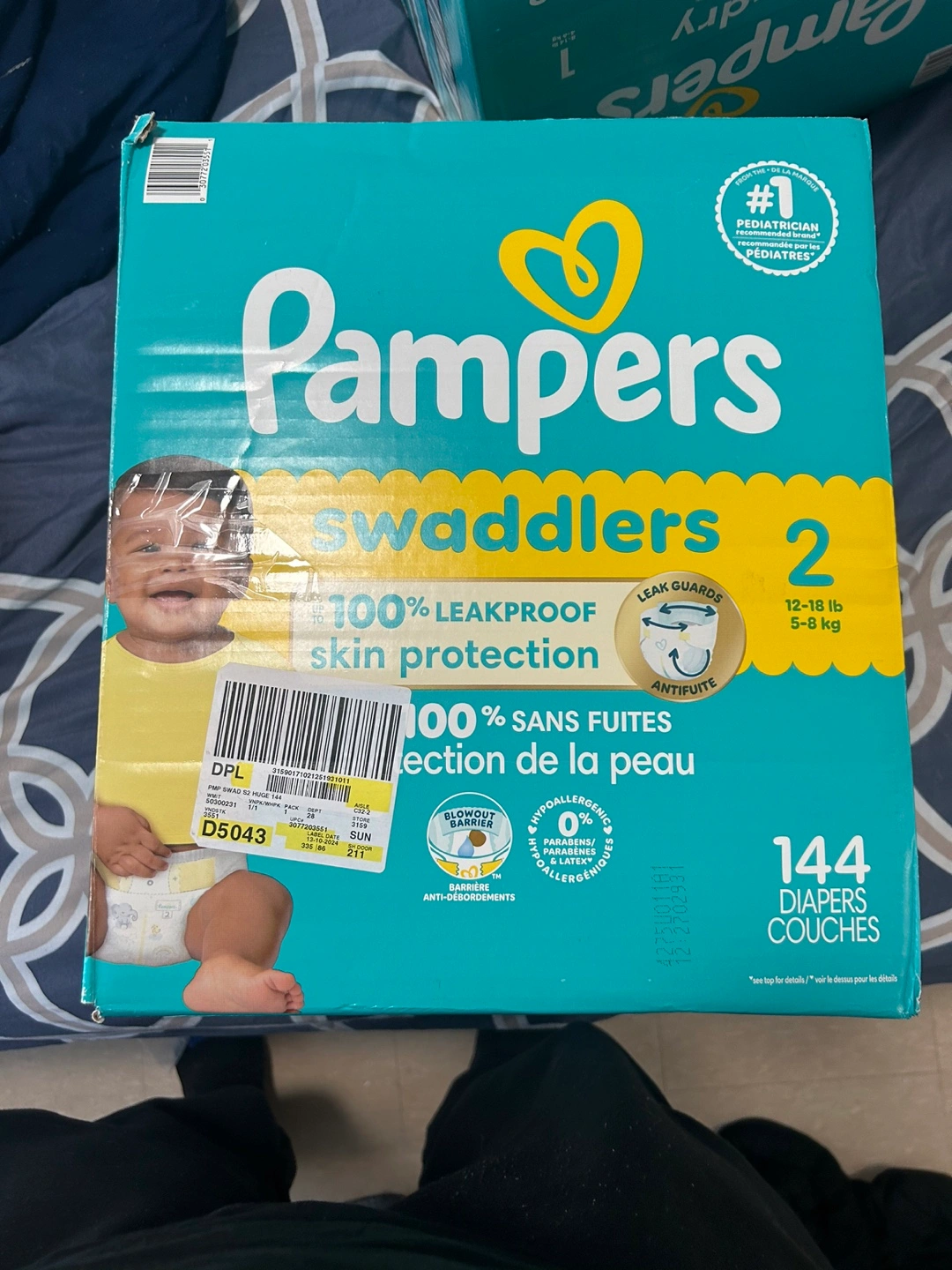 Selling a box of Pampers Swaddlers diapers, size 2. These are designed for babies weighing 12-18 lb (5-8 kg). The box contains 144 diapers, offering 100% leakproof skin protection and a blowout barrier. They're also hypoallergenic, free of parabens and latex