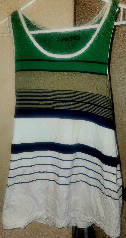 590Tony Hawk tank top in size medium. The shirt is striped with green, olive, navy, and white. It's made of 100% cotton. Style/Model # HAAK0019317. pick up only.