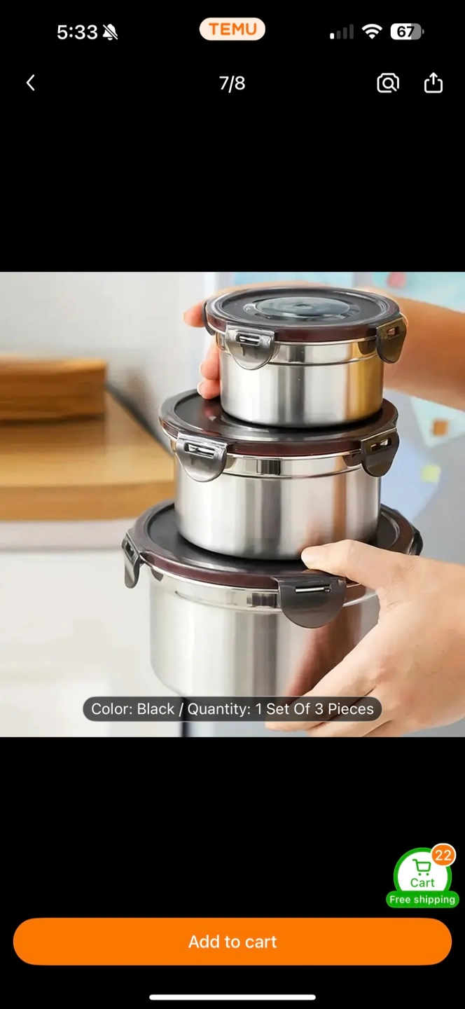 Selling a set of three Temu stainless steel food containers. These fresh-keeping containers are leak-proof and come in black. Perfect for storing leftovers or packing lunches!