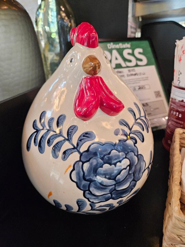 Check out this charming ceramic chicken! It's got a lovely blue floral design painted on it. Perfect for adding a touch of country style to your kitchen or dining area. It's in great shape and ready to find a new home!