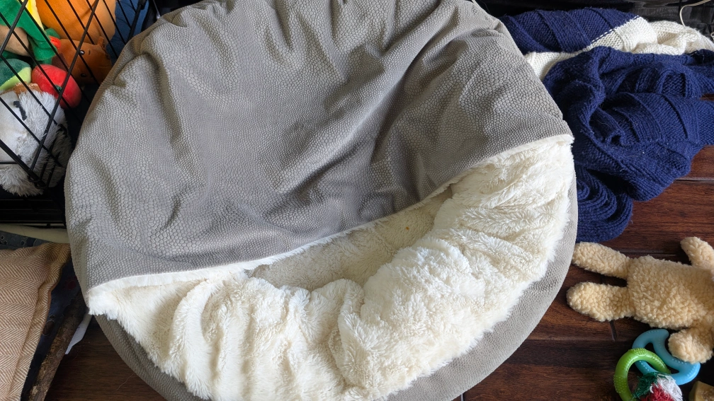 65Selling a comfy grey pet bed! It features a soft, plush lining that your furry friend will absolutely love. Perfect for cats or small dogs! Basically new as the dogs are not using it and been keeping dog toys in it lol