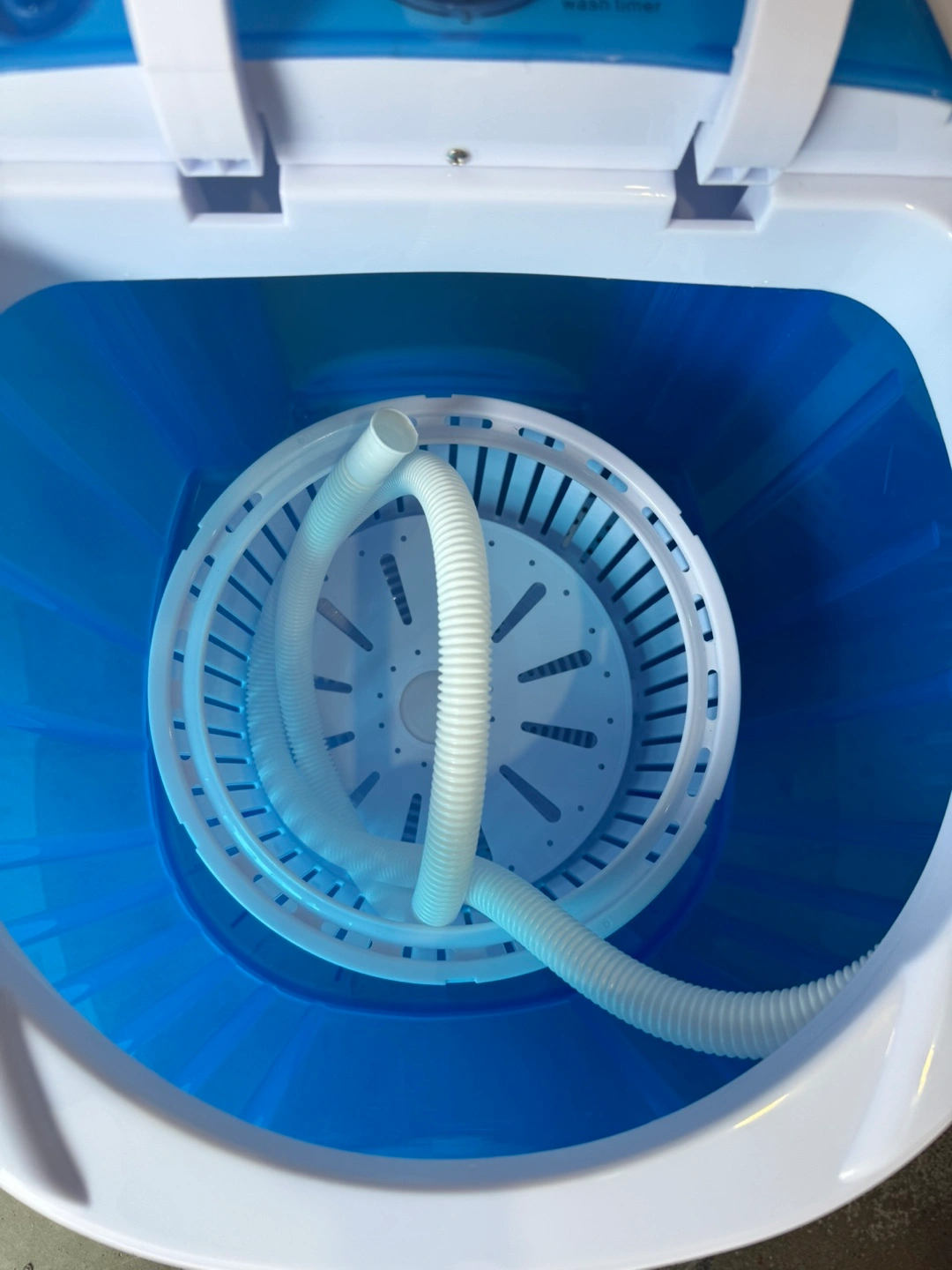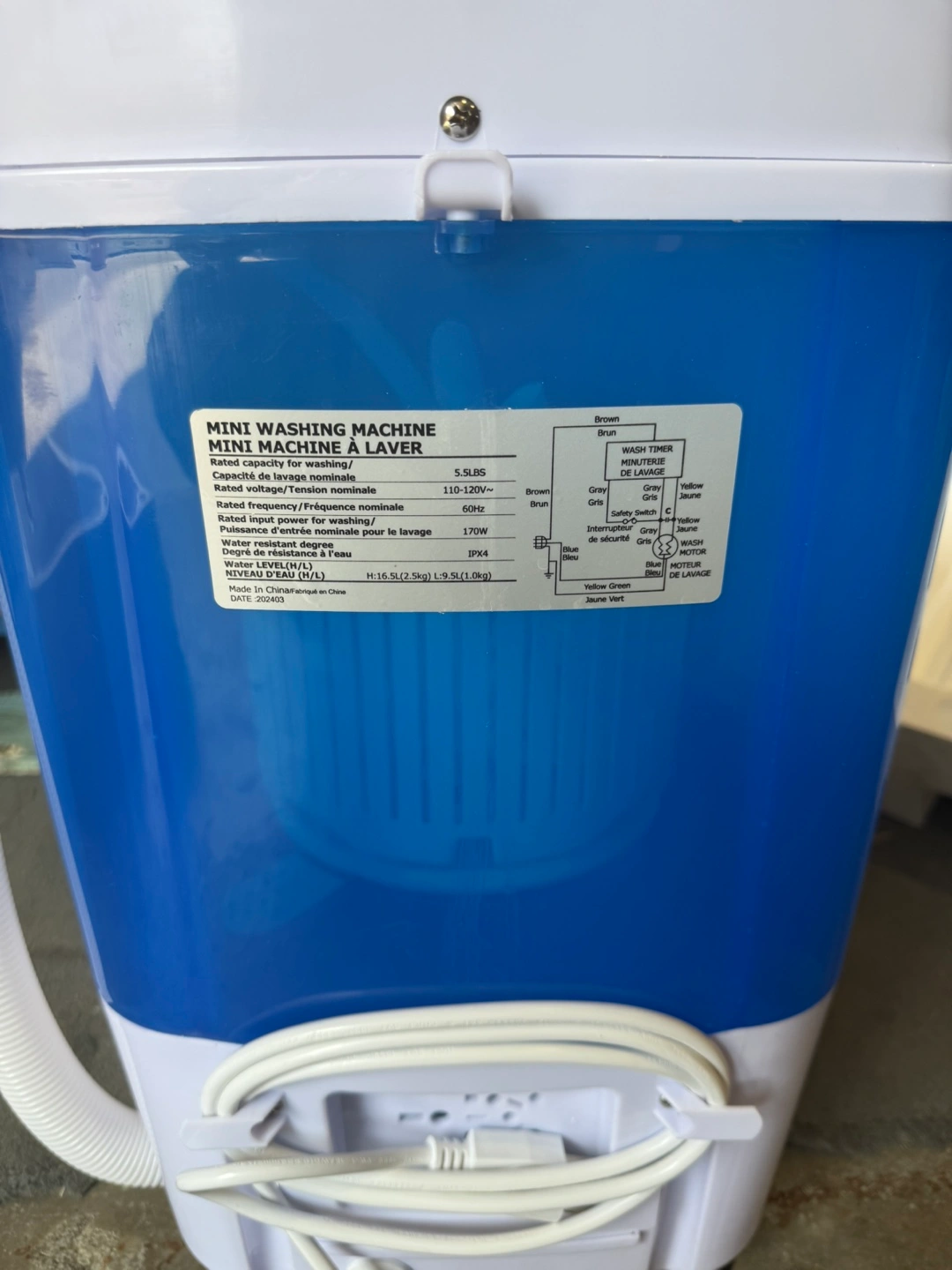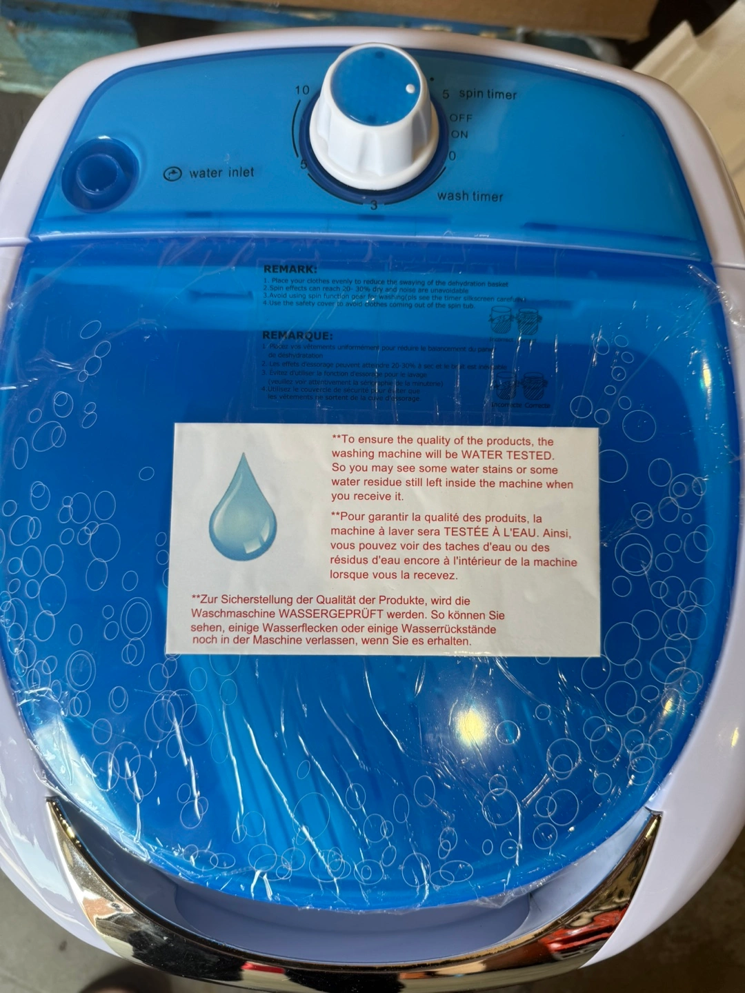 75This washing machine is portable and compact. It is perfect for your limited space such as dorm, apartment, condo, motor home, RV, camping and more. And the light weight makes it easy for moving. This laundry washer allows you to simply put in your load of clothes, fill with water, set the timer, then start washing. What’s more, our washing machine features a drain tube which allows you to easily drain out dirty water. Single tub washing machine with spin basket up to 10 minutes (wash) and 5 minutes (spin) with the control timer to meet your different needs. Clear lid makes you easy to see and monitor the water condition. And the small size with low power consumption can save much energy. When you turn on the water you have to stay by the washer to watch it because it does not stop filling with water by it self Pick up in Mississauga near the intersection of Highways 401 and 403