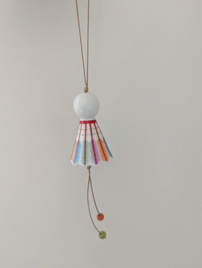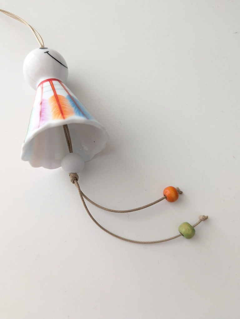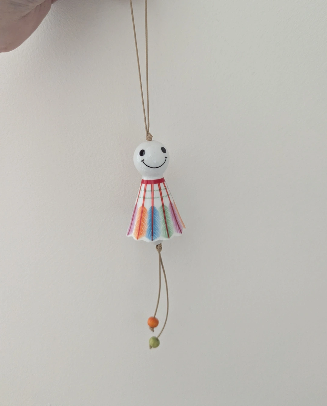 Small porcelain wind chime with a smiling face and colourful feather design. It has a rope with wooden beads.