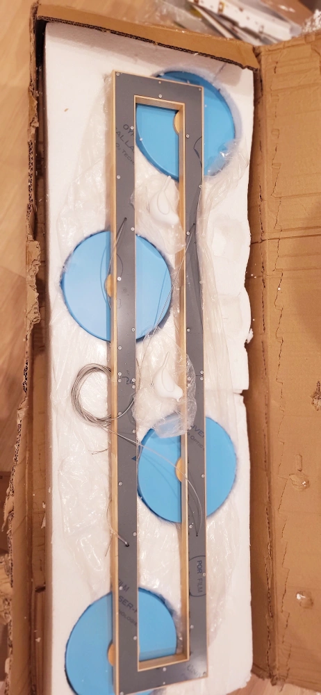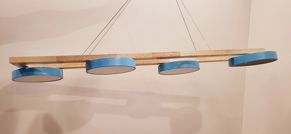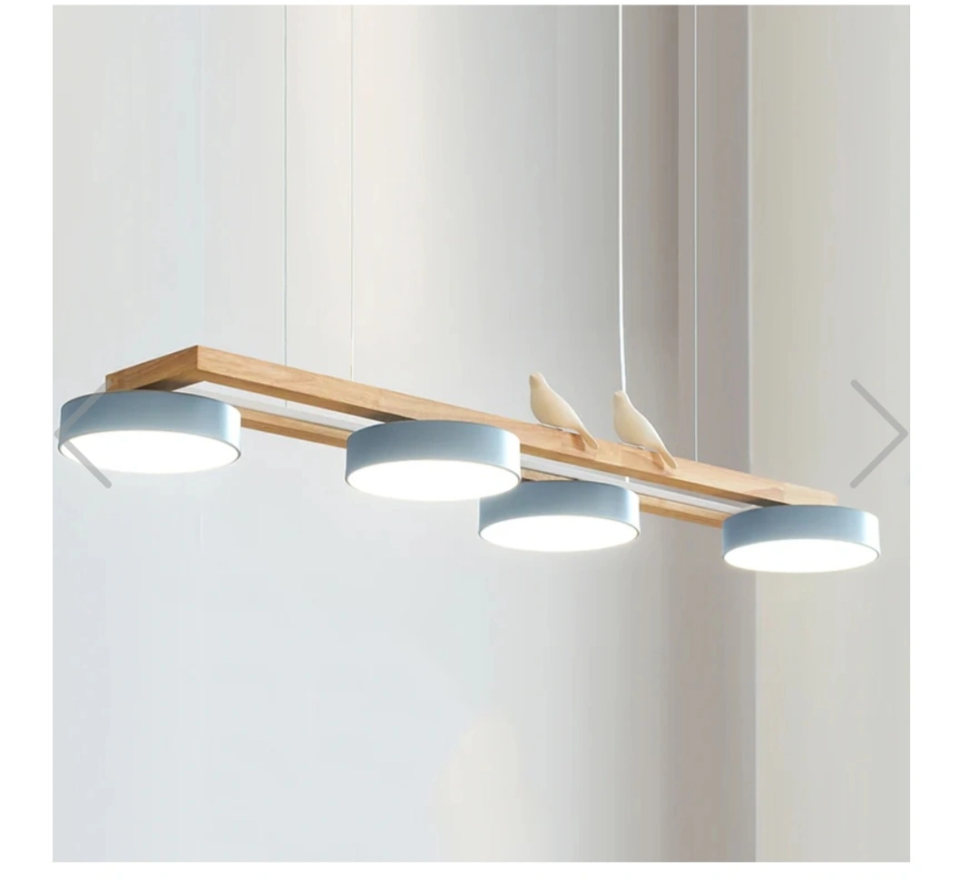 This is a brand new LED ceiling light still in its original box! It features a modern design with blue and wood accents. Perfect for kitchen islands, kid's rooms, daycares or any room to add a touch of colorful fun and whimsy!