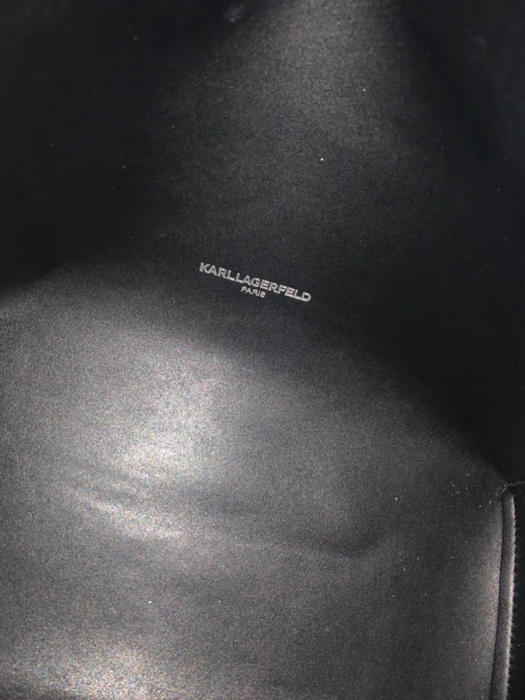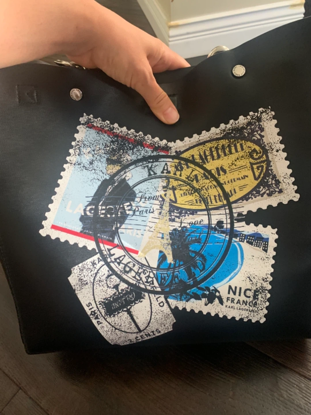 This is a Karl Lagerfeld Paris black tote bag. It features a stylish design with stamp-like graphics. Perfect for carrying your everyday essentials!