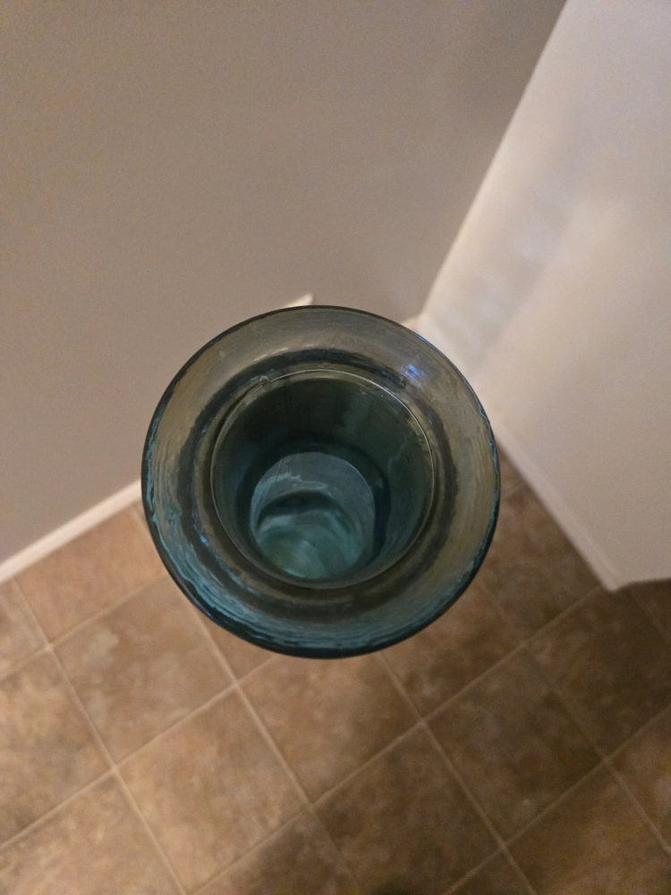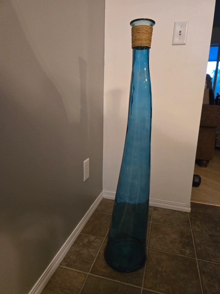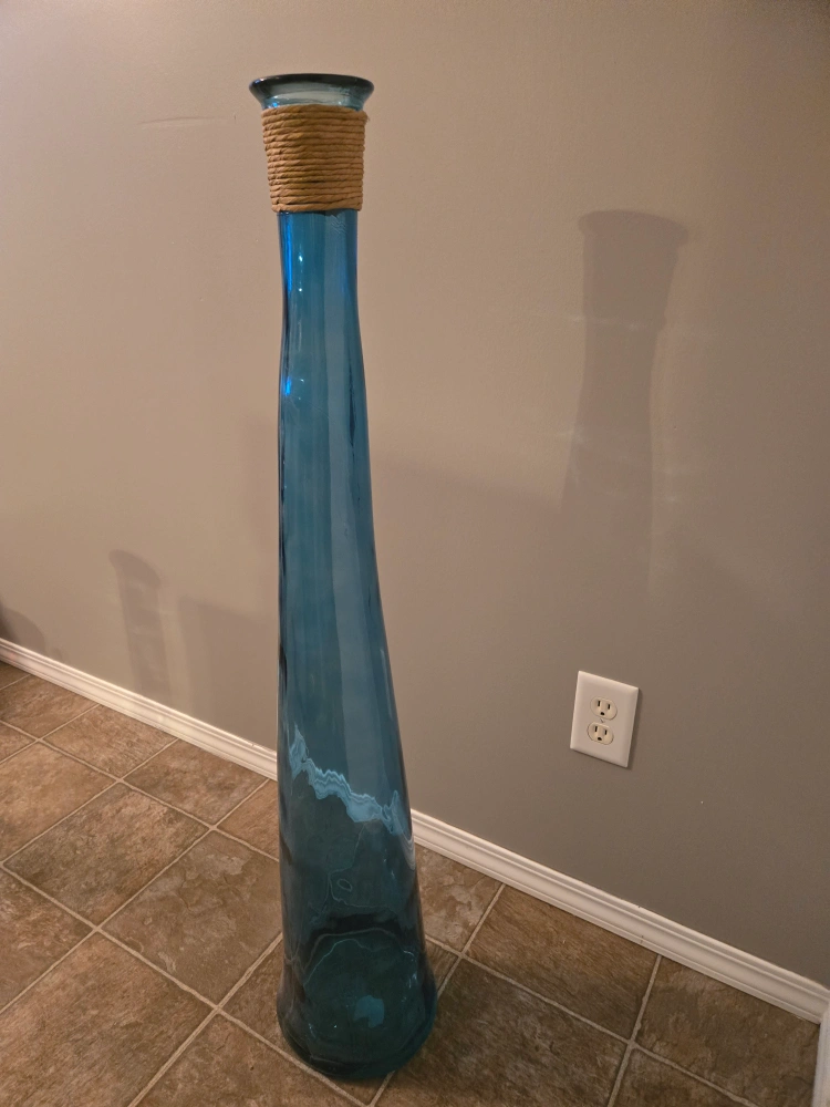 Selling a tall, elegant blue glass vase! It has a unique shape and a decorative rope accent around the top. It would look great as a floor vase or as a statement piece. It's in great condition, ready to add a touch of style to your home