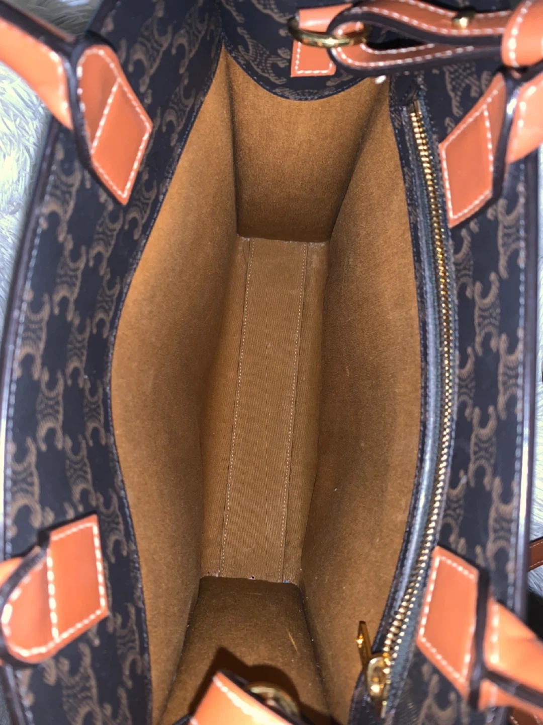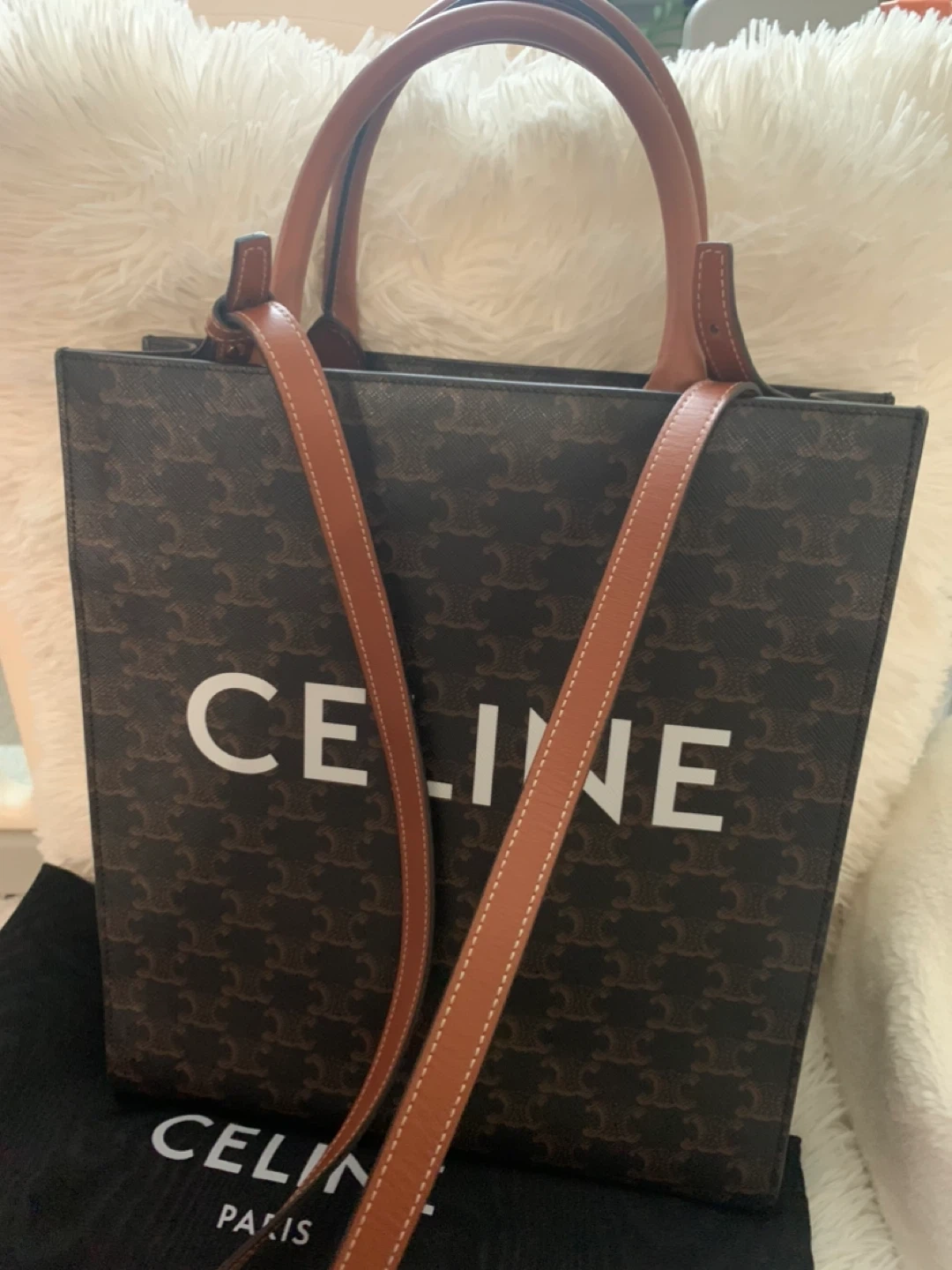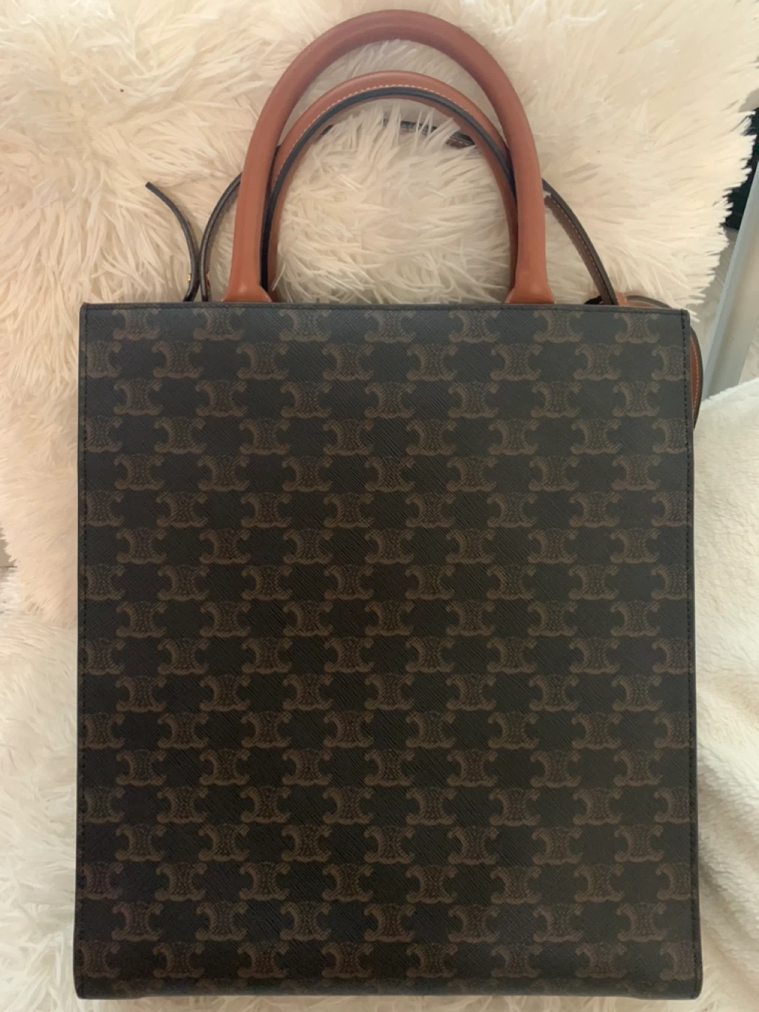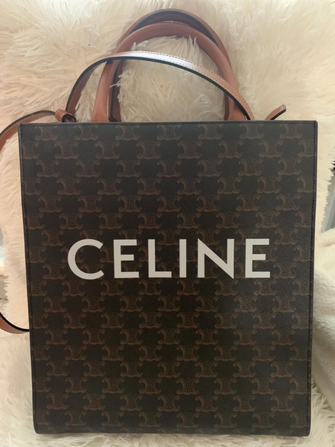 Celine logo in white on a brown patterned background with brown leather straps. It's in great condition and ready for a new home! Authentic comes with original dustbag and Entrupy/Certificate of Authenticity.