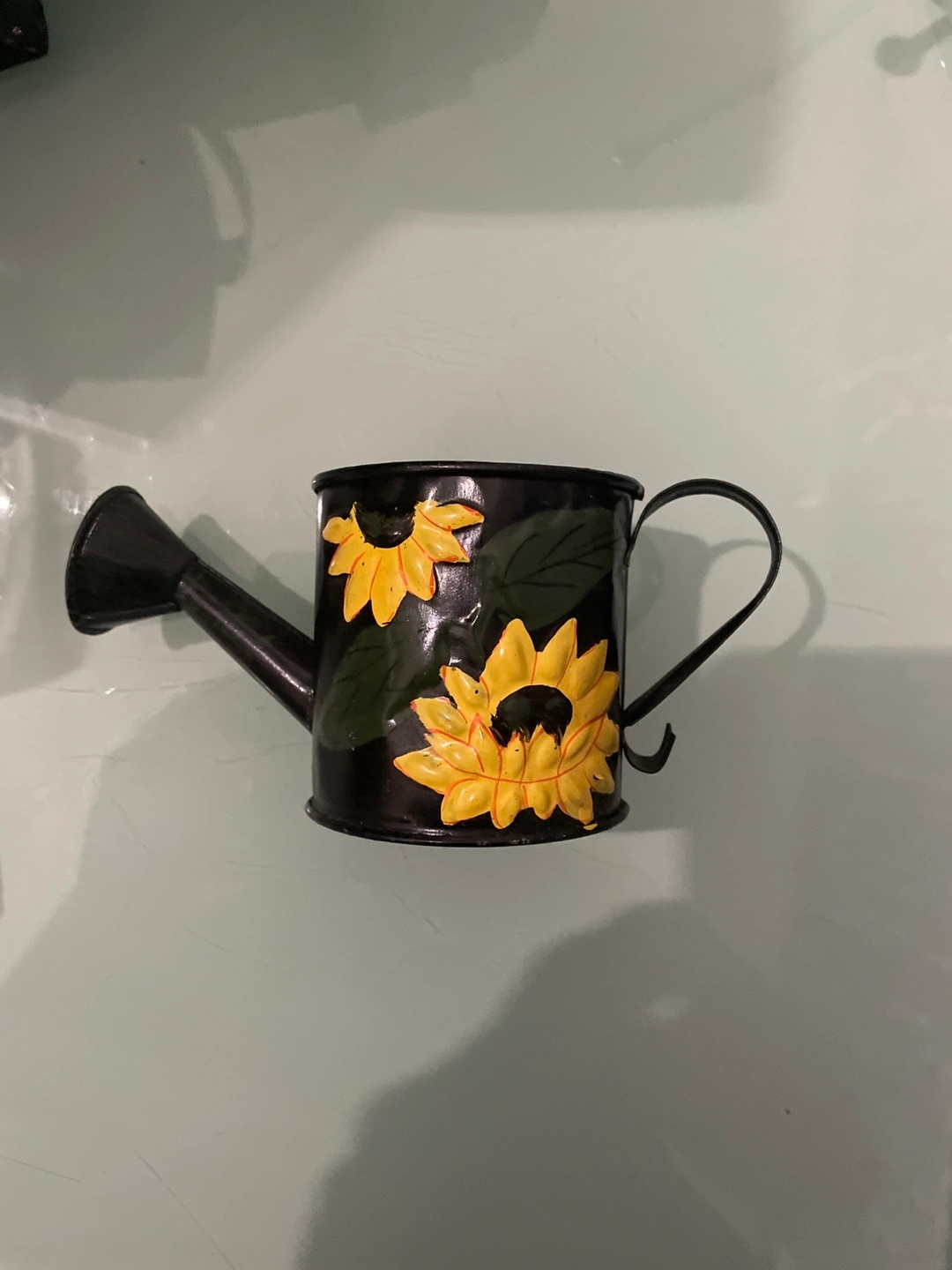 A cute little watering can, perfect for adding a touch of charm to your home decor! It's black with bright sunflower designs. The size is approximately 3 inches tall🥕