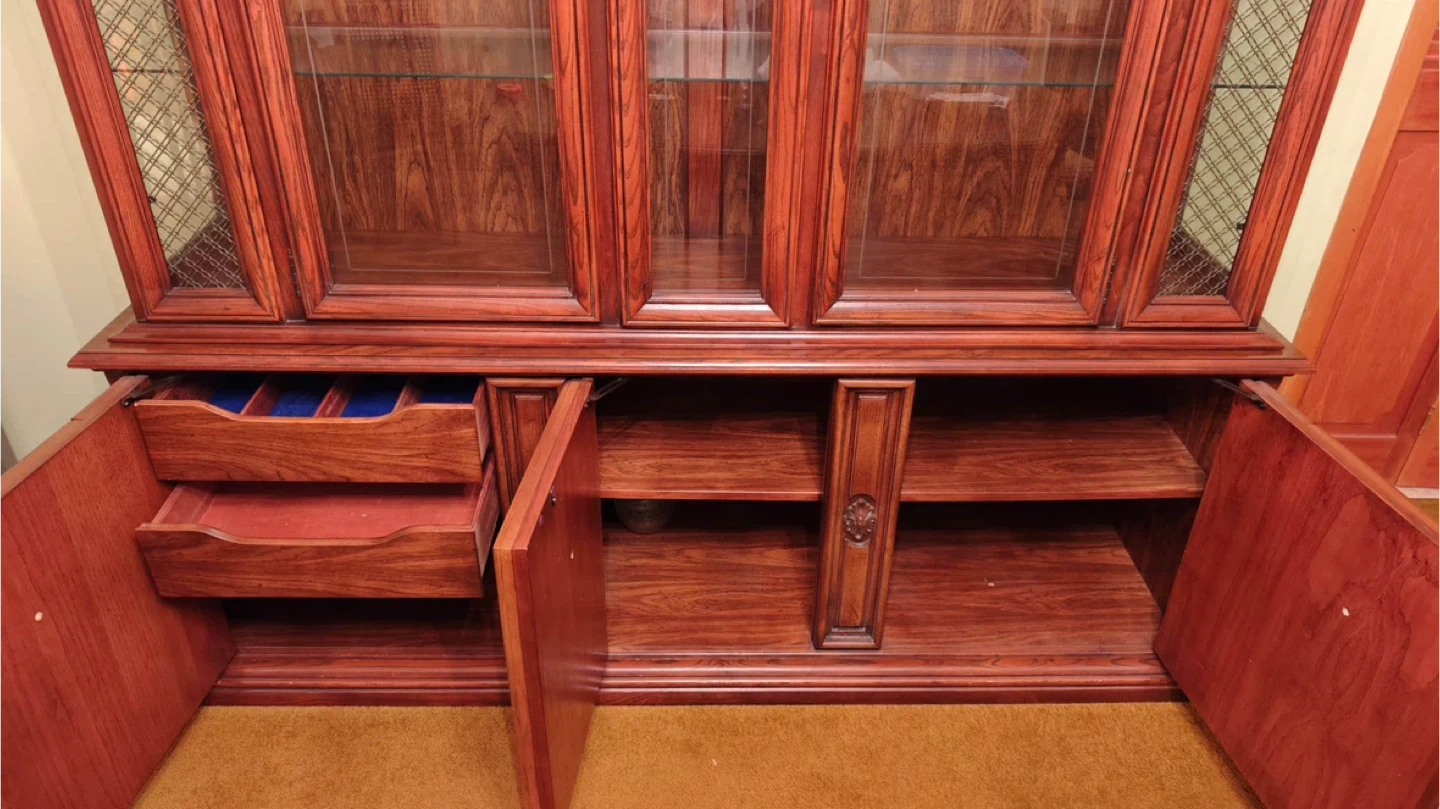 Beautiful antique-style hutch and buffet crafted from solid wood in decent condition. Offers ample storage space for dining table settings, serveware, and accessories.