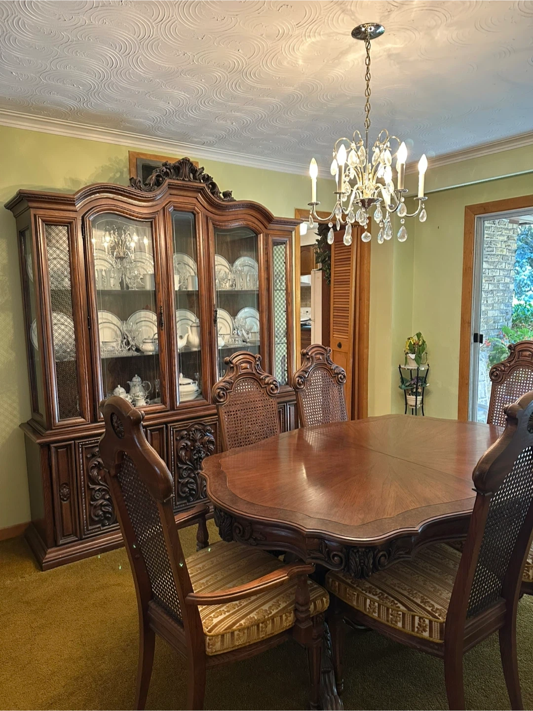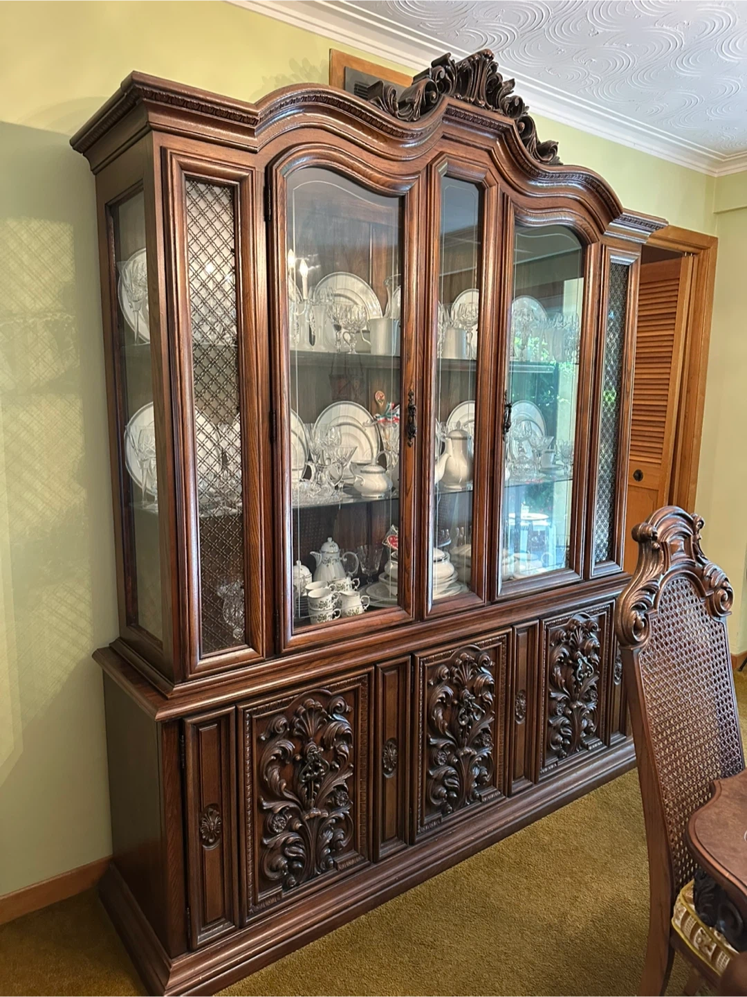 Beautiful antique-style hutch and buffet crafted from solid wood in decent condition. Offers ample storage space for dining table settings, serveware, and accessories.