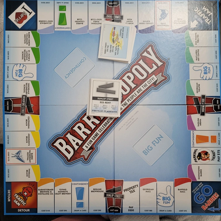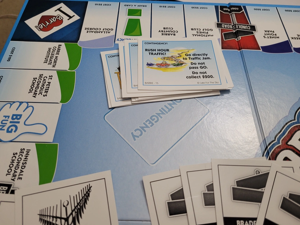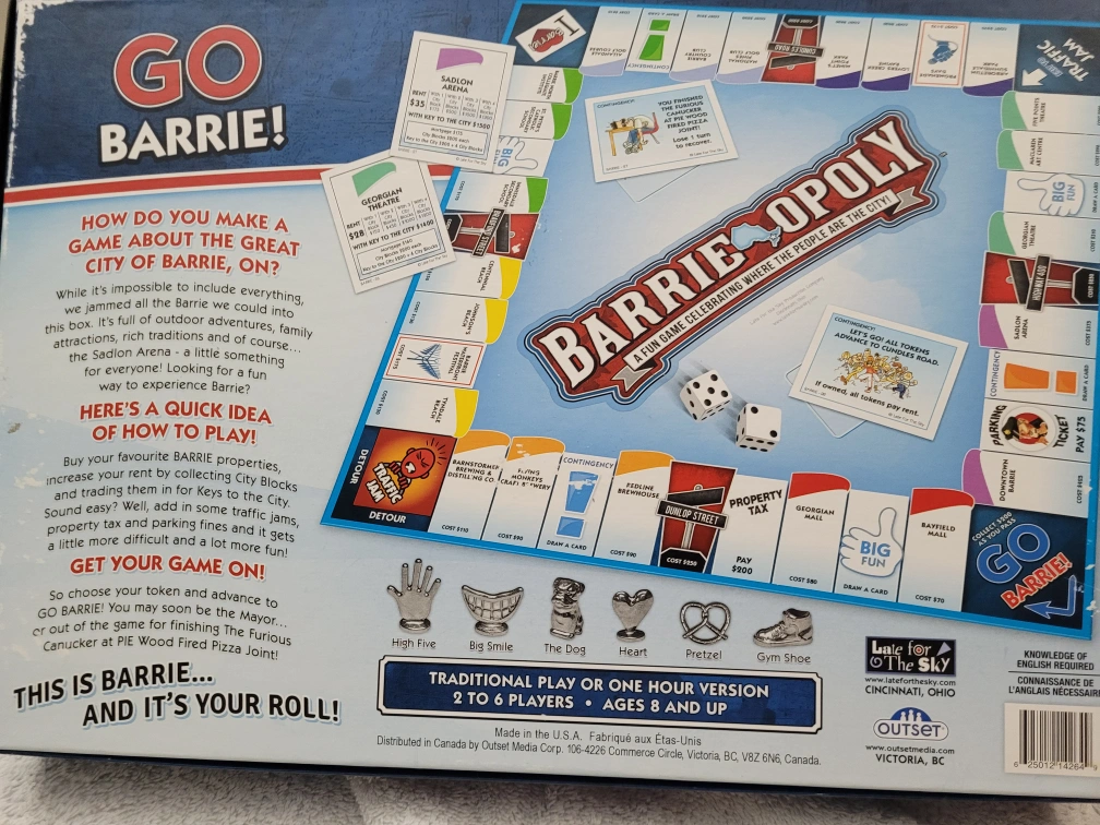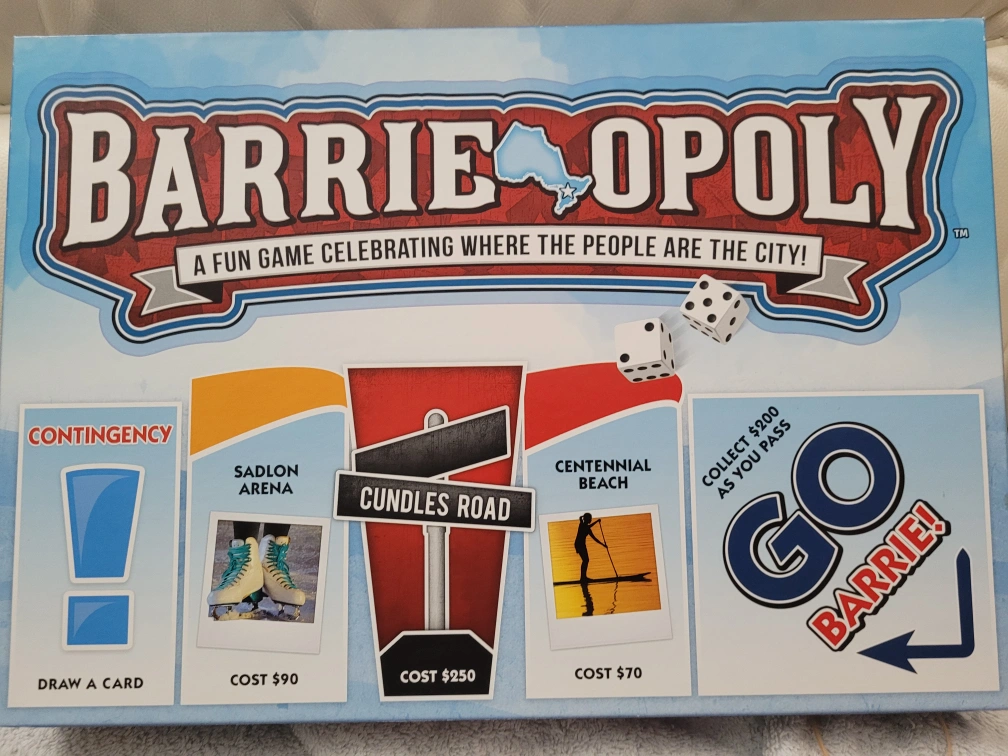 Giving a Barrie-Opoly board game! It's a fun game celebrating where the people are the city! The game is for 2 to 6 players and is for ages 8 and up! Perfect for family game night.