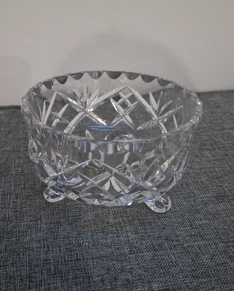 This is a lovely crystal glass bowl with a star pattern design. It has three little feet. Measures about 4.5 inches in diameter. Perfect for candies or small items!