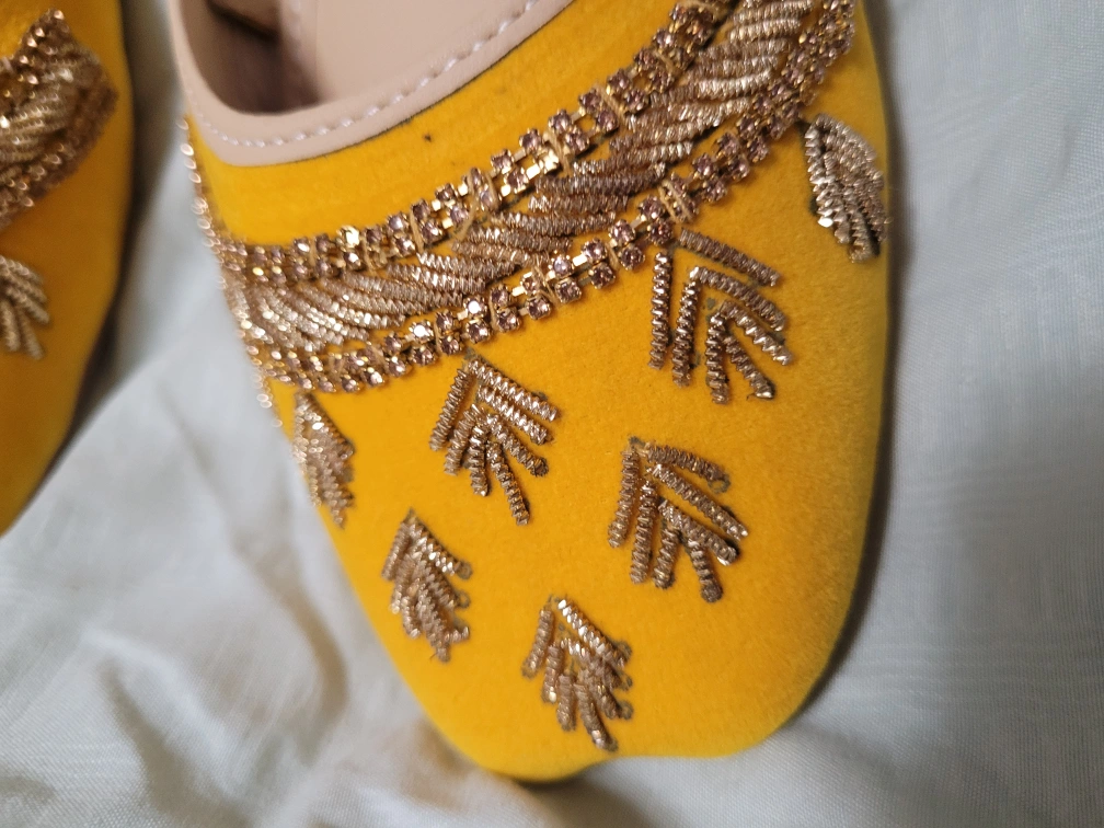 These are a pair of beautiful canary or mustard yellow flats / jutti / khussa. They are size 10 and feature intricate gold embroidery. leather soles. new