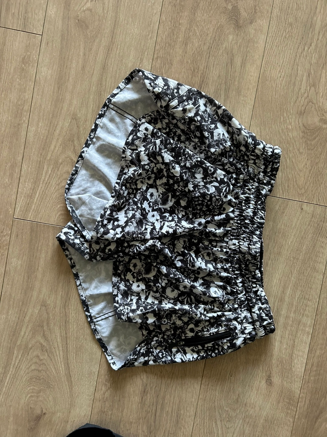 GUC. Cute Lululemon running shorts with a black and white floral print! They're in great shape and ready for your next run or workout. Perfect for staying comfy and stylish while you're active
