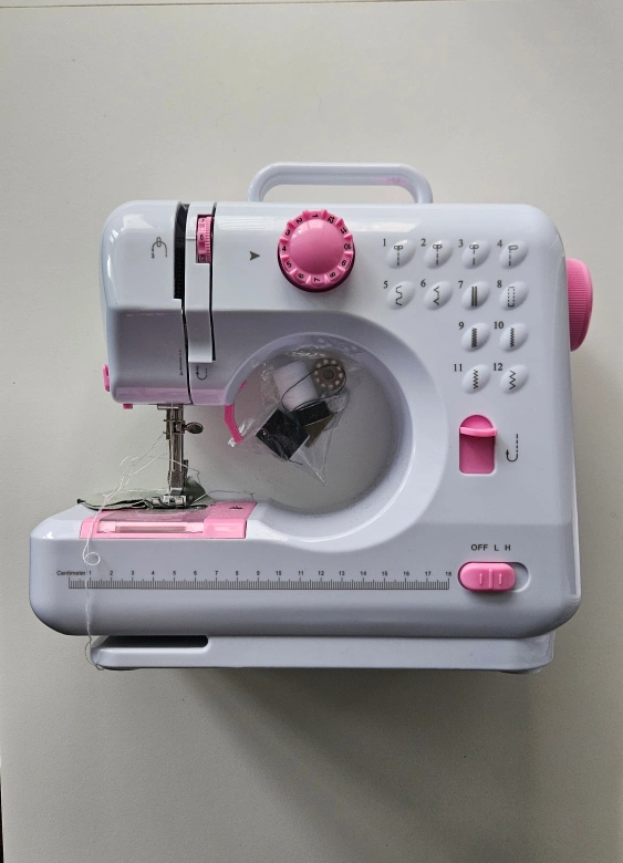 I'm selling a portable mini sewing machine. It's in great condition and perfect for small projects or beginners. It's lightweight and easy to store, making it ideal for new learners or younger users. Pedal and power adapter included, as well as guide board.