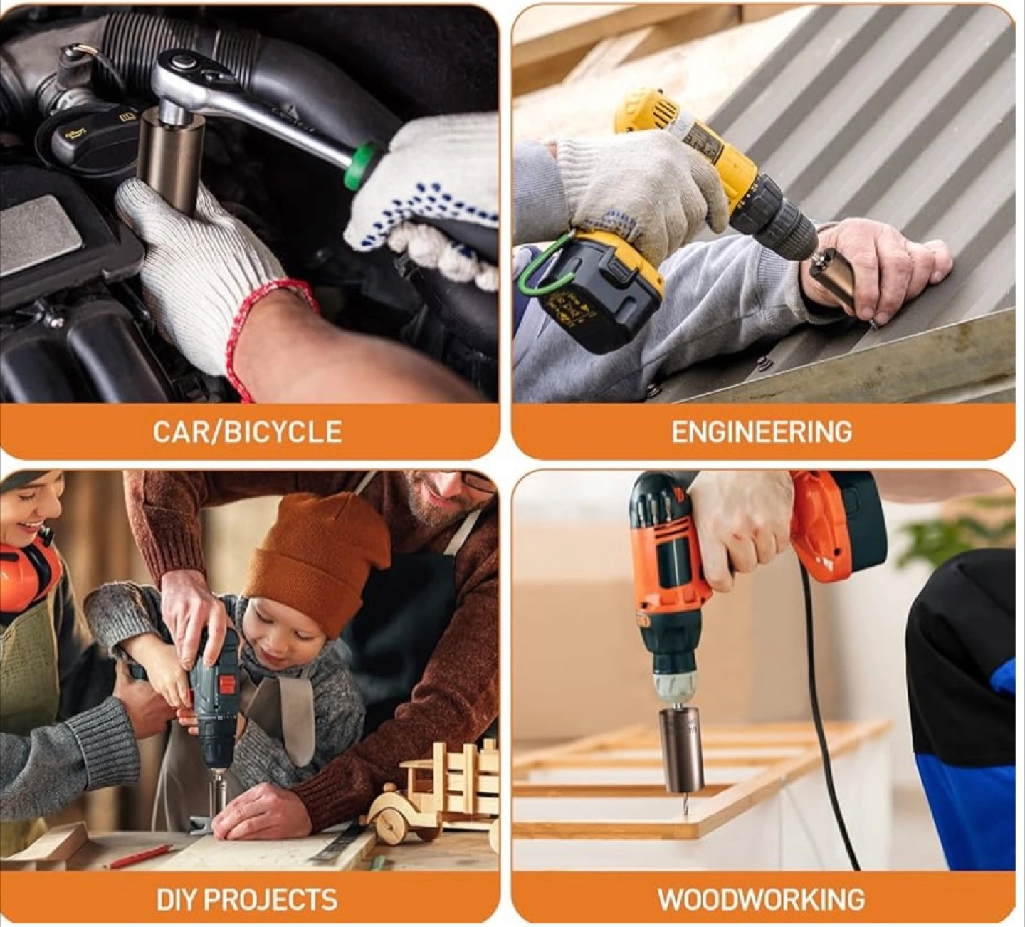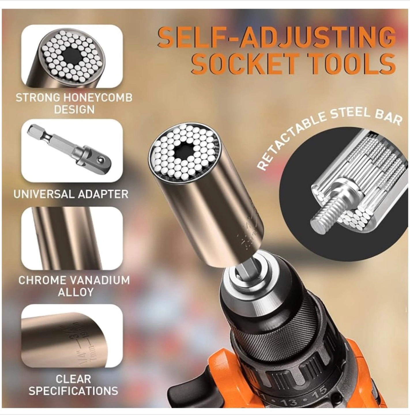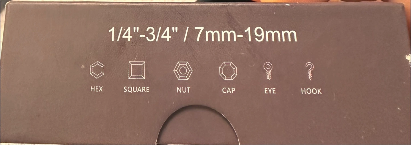 20Selling a universal socket, great for home improvement and DIY projects! It can handle sizes from 1/4" to 3/4" (or 7mm to 19mm). Perfect for various screws, including hex, square, nut, cap, eye, and hook types