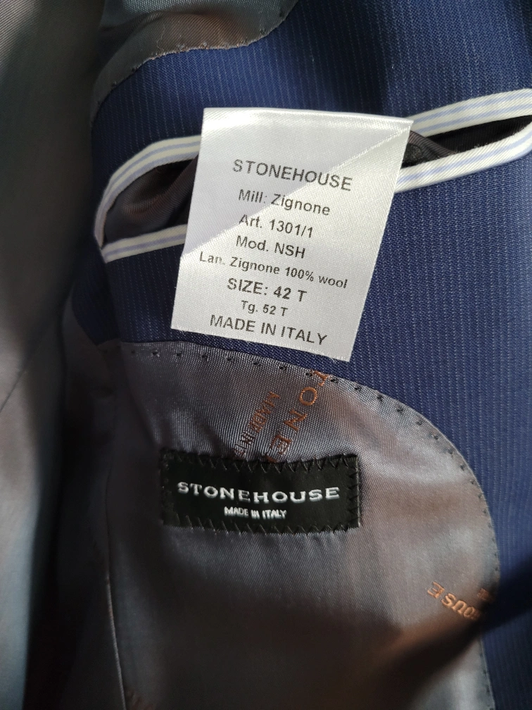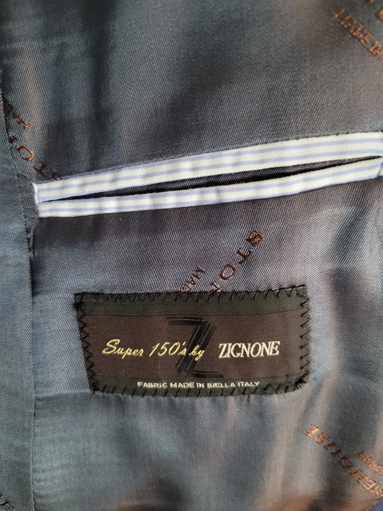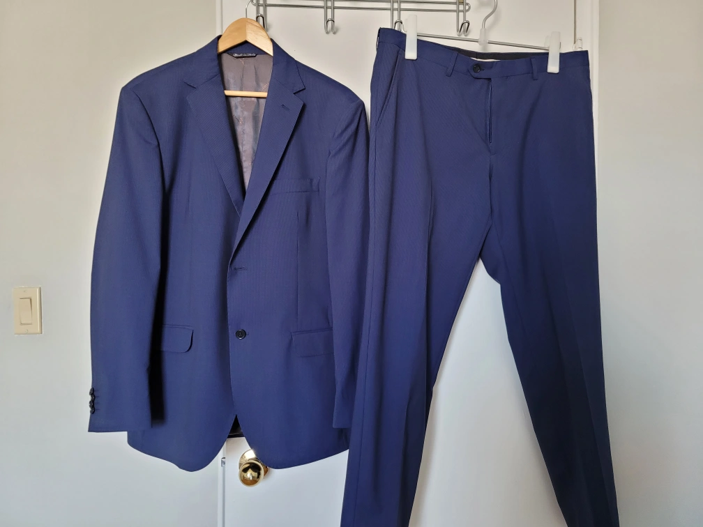 281Only used twice for the occasions. Men's suit, navy blue. Jacket and trousers. Made in Italy. Jacket measures 18" across shoulders and 30" in length. Excellent condition.
