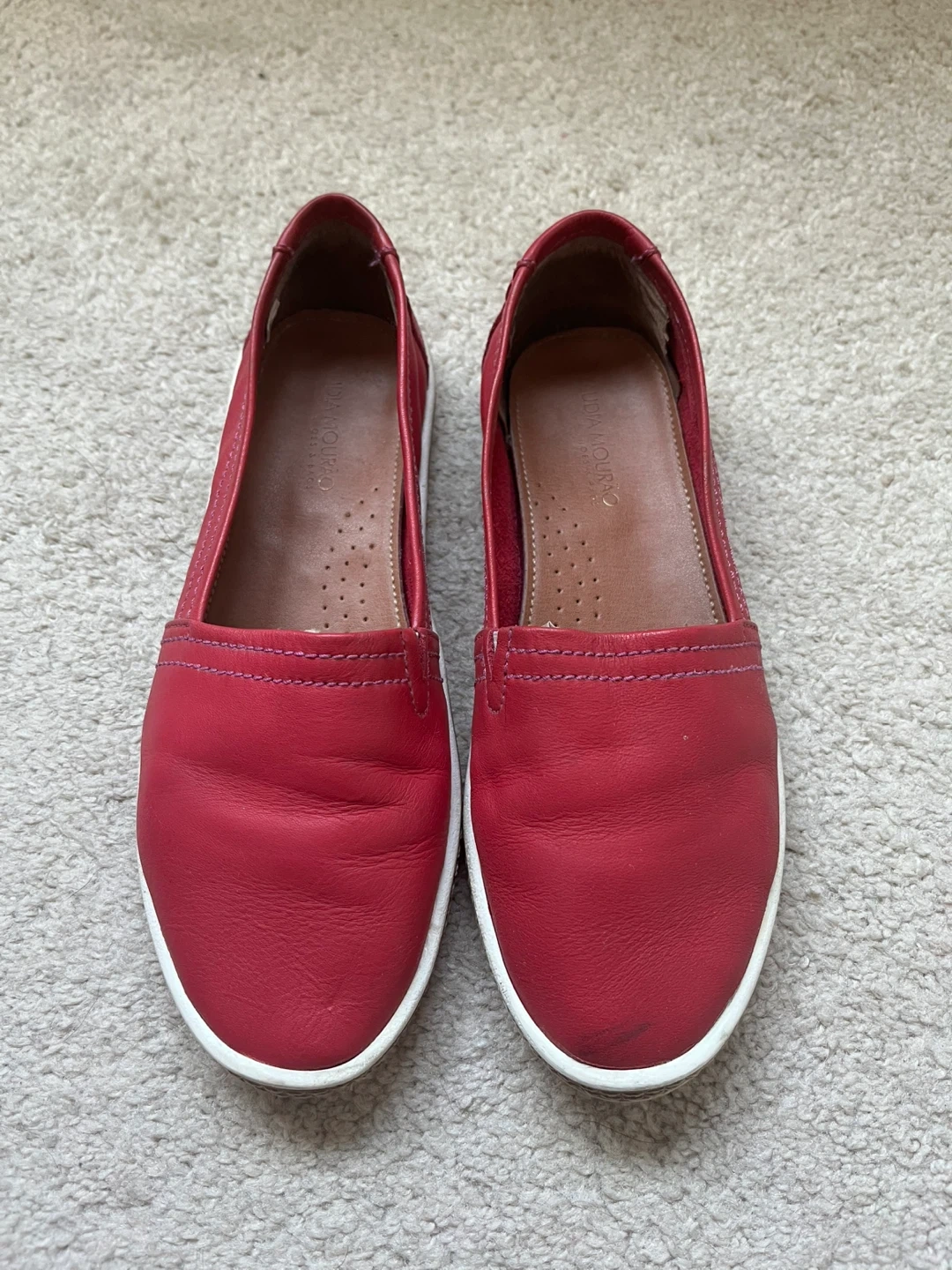 Selling a pair of Claudia Mourão loafers in red leather. They are a US size 7 and made in Brazil. They fit large, closer to 7.5-8. There is a small scuff on the toe of one shoe, and the soles show some wear.
