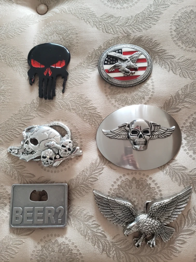 Selling a lot of five unique belt buckles. They are in good condition and ready to add some flair to your wardrobe! Includes a Punisher skull, eagle, and skull with wings, $10 for the small, $12 for the medium and $15 for the large ones, or $60 for the whole collection.