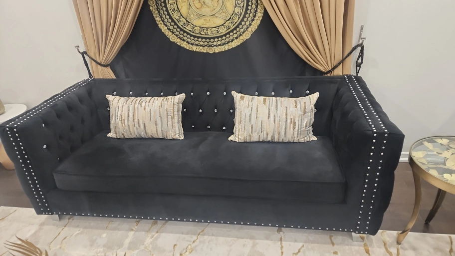 Selling a stylish black velvet loveseat sofa. It's in great condition and would look fantastic in any living room or den. The velvet material is soft and luxurious, and the studded detailing adds a touch of elegance.