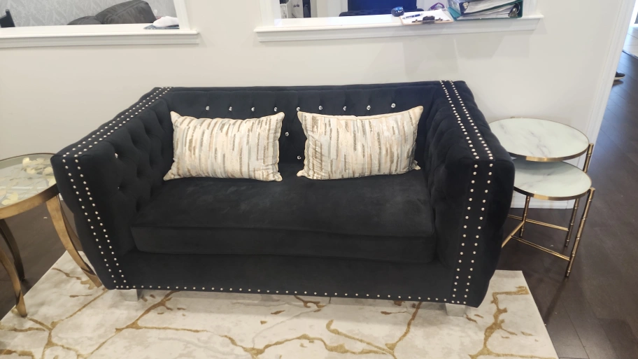Selling a stylish black velvet loveseat sofa. It's in great condition and would look fantastic in any living room or den. The velvet material is soft and luxurious, and the studded detailing adds a touch of elegance.