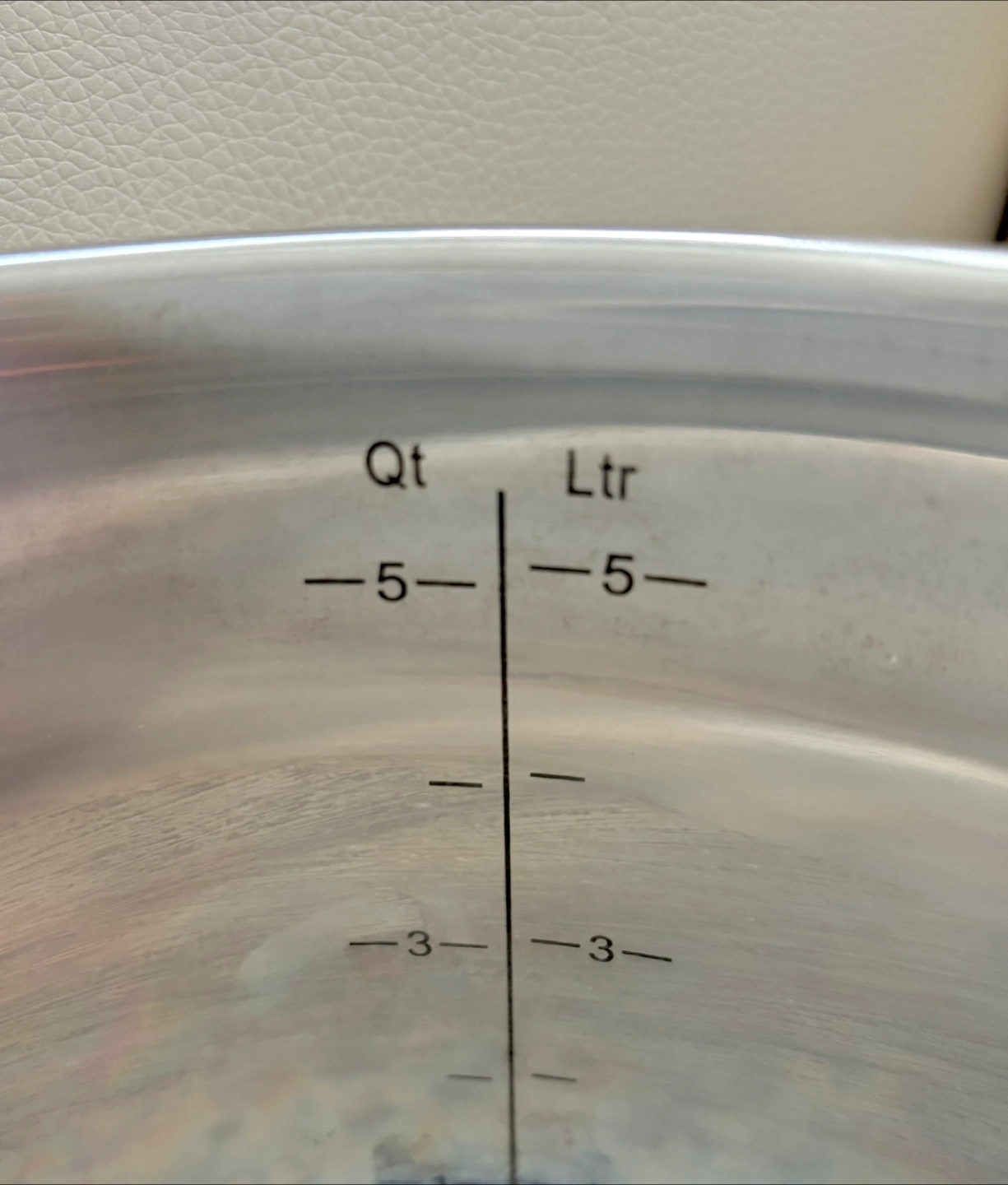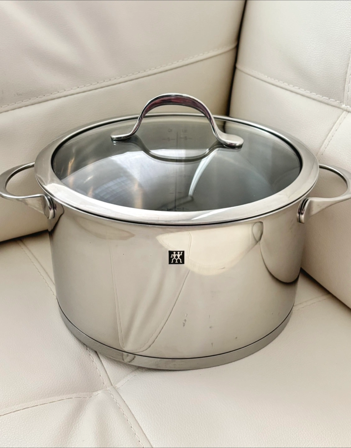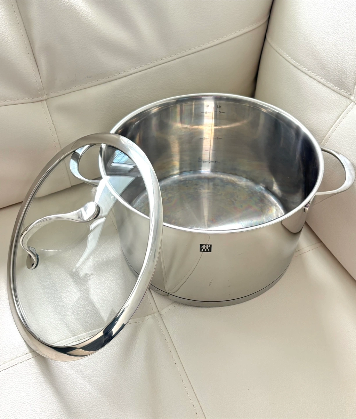 It's a 5-quart (5L) pot with a glass lid. The pot is made of 18/10 stainless steel