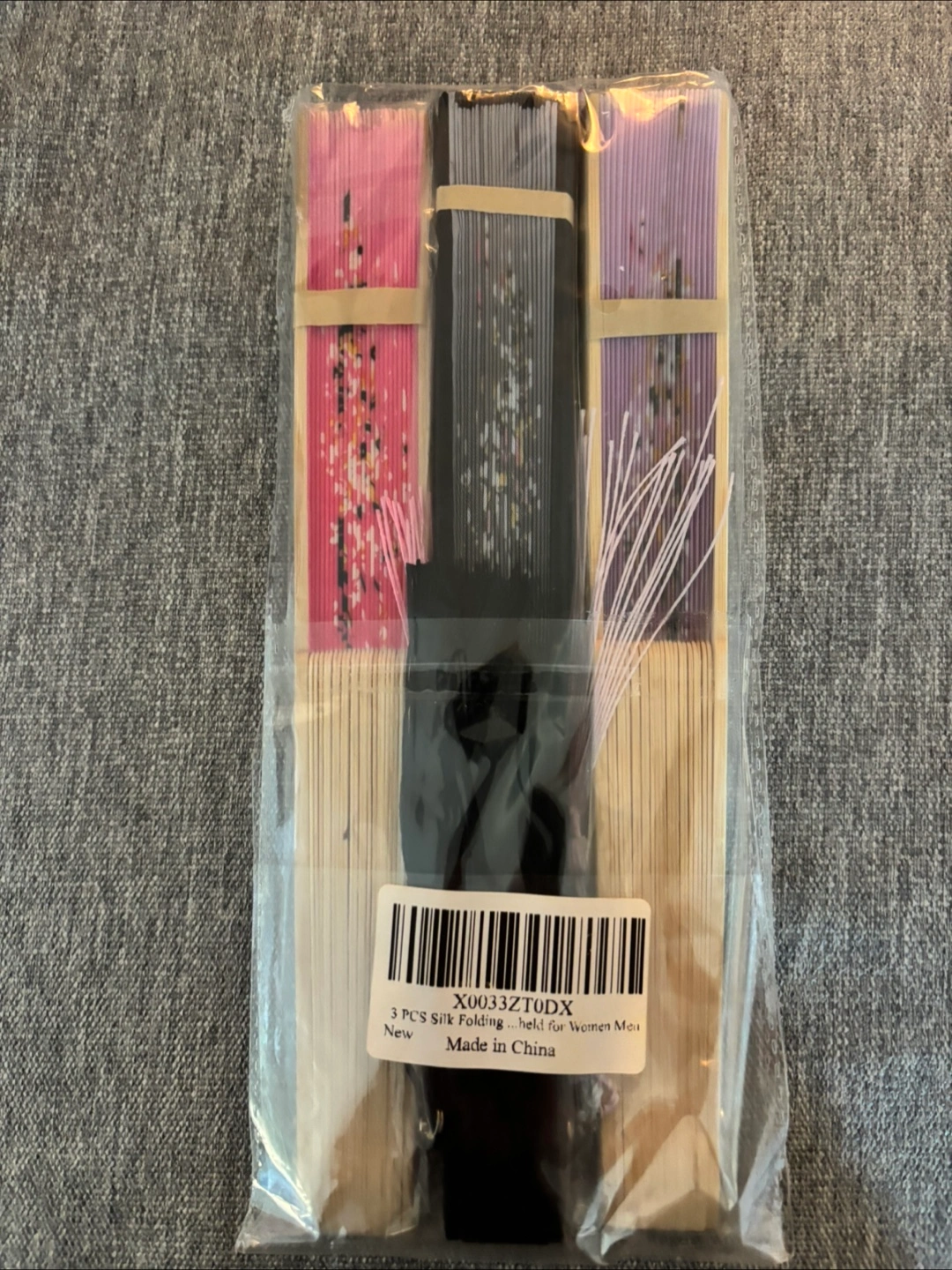 Brand new set of 3 silk folding hand fans, still in the original packaging! These fans are perfect for women and men, adding a touch of elegance to any occasion. Made in China and ready to go to a new home!