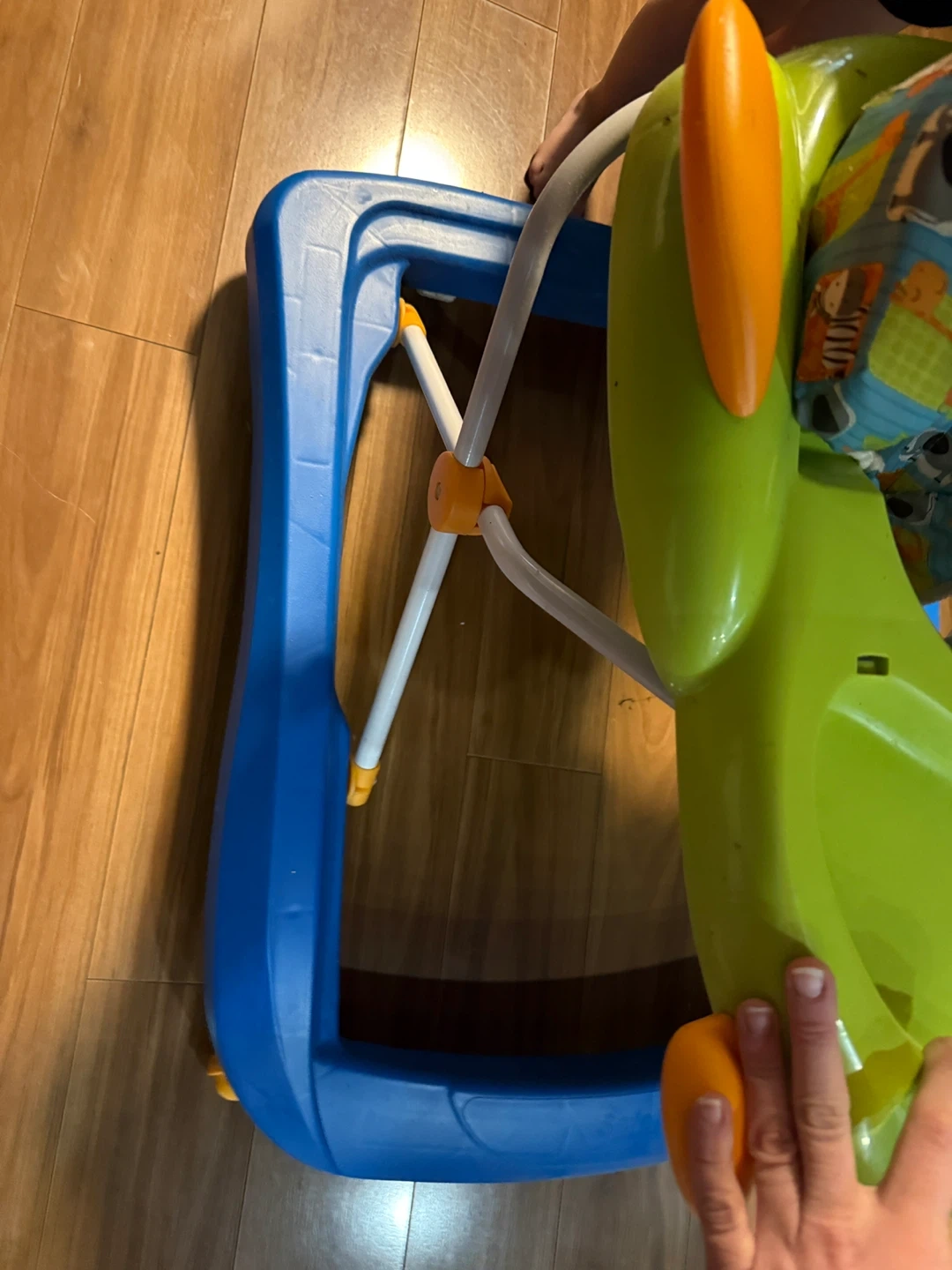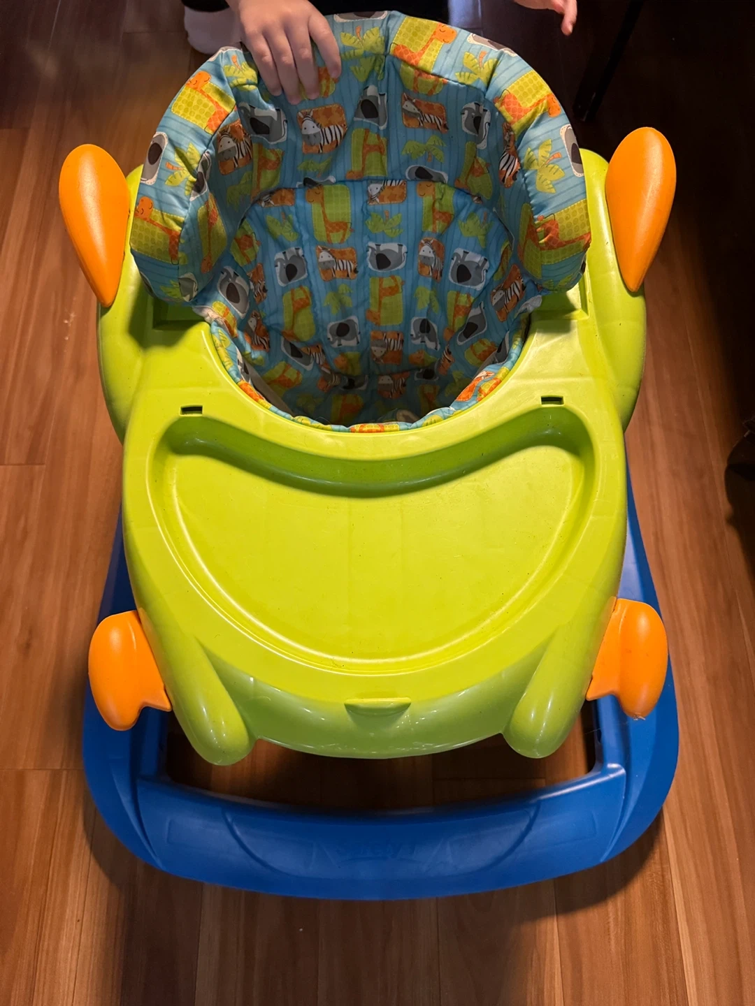 Selling a Safety 1st baby walker! It's in great condition and ready for a new home. The seat has a fun animal print, and the frame is a sturdy blue. Perfect for keeping your little one entertained!