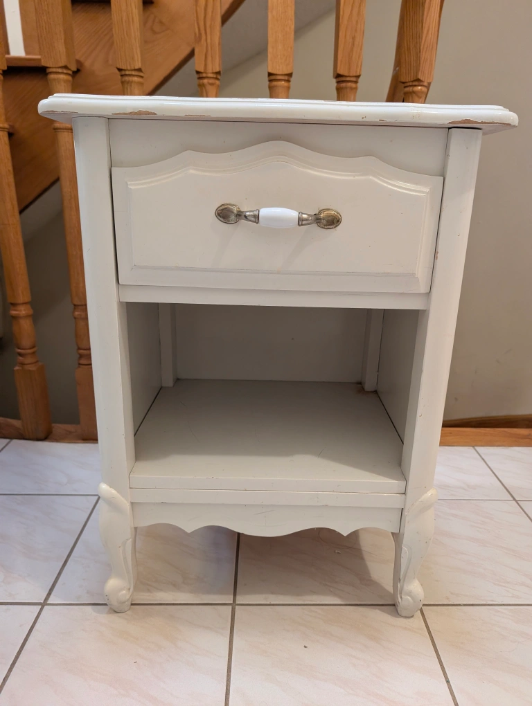 This cute wooden nightstand is perfect for an upcycling project! It features a drawer and an open shelf for storage. The back indicates that it's proudly Made in Canada and it's solid wood. It has some signs of wear and tear, which adds to its character!