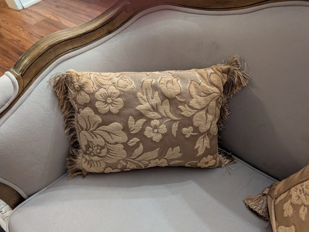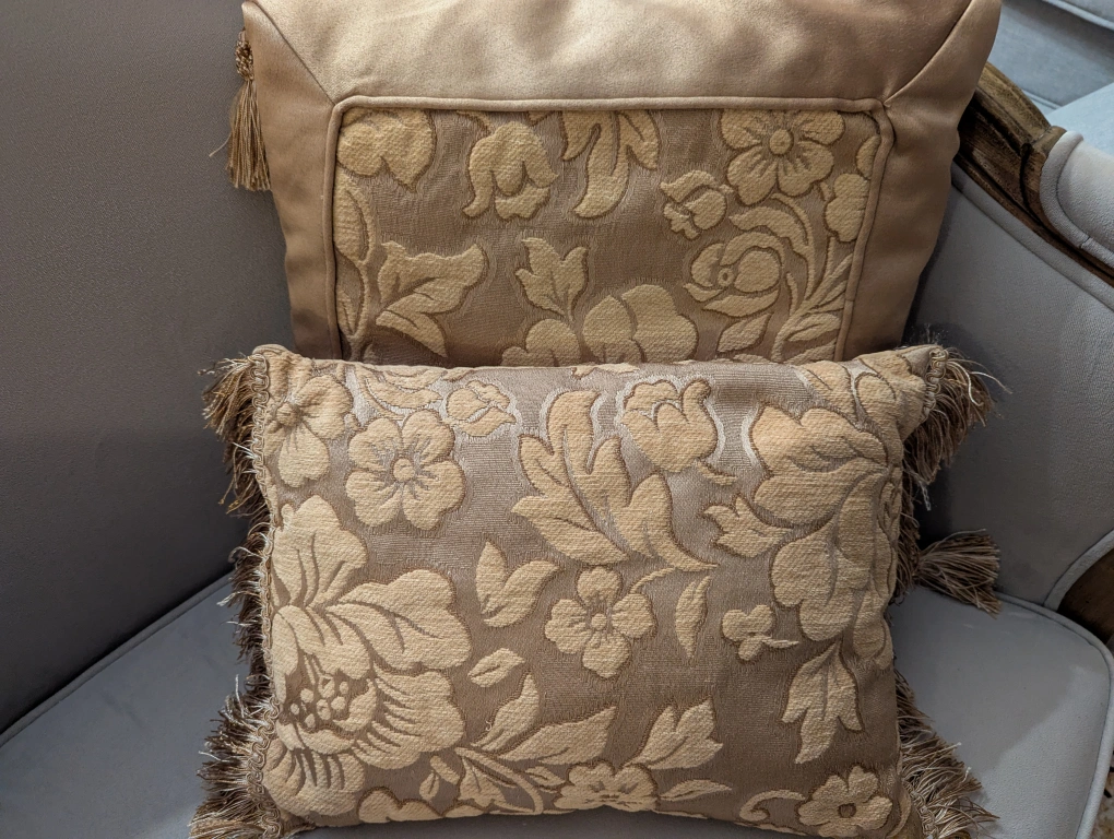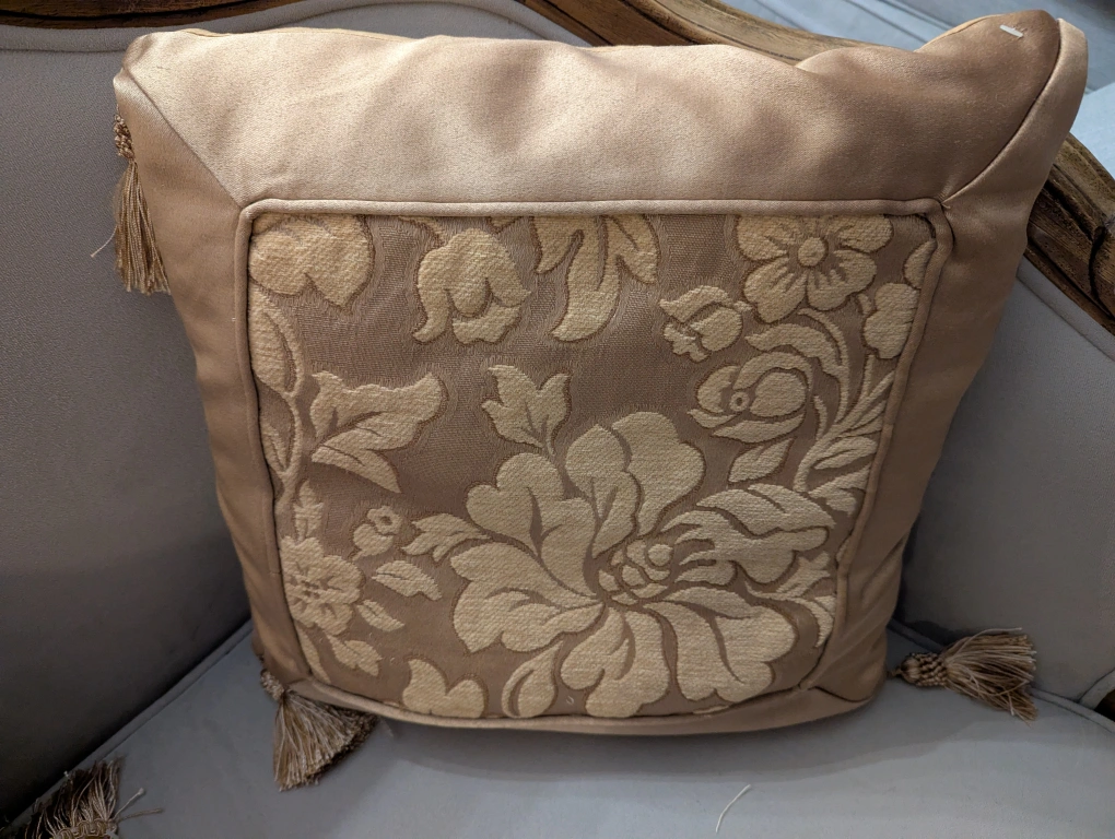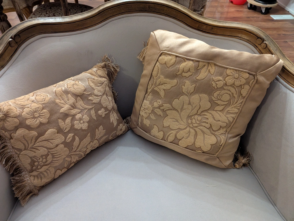22Selling a set of two decorative throw pillows. They feature a beautiful floral pattern in a neutral, beige tone. They add a touch of elegance to any sofa or chair. Perfect for adding a cozy and stylish accent to your home decor!