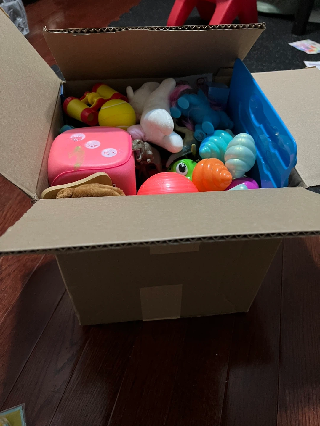 Gifting a box of assorted toys in various used condition. There's a variety of items, including toy cars, figurines, plushies, and other fun things! Perfect for kids (swallowing risk for babies).
