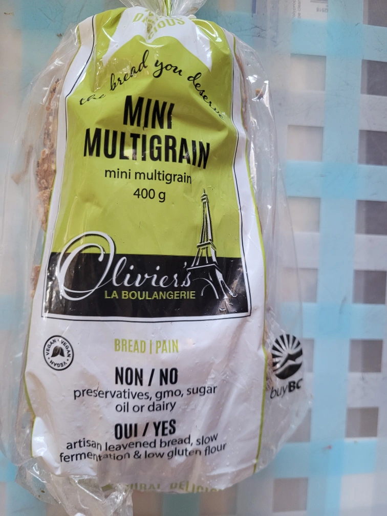 Selling a bag of Oliviers La Boulangerie Mini Multigrain bread. It's a 400g bag of artisan leavened bread that's free of preservatives, GMOs, sugar, oil, and dairy. Perfect for a healthy and delicious snack!