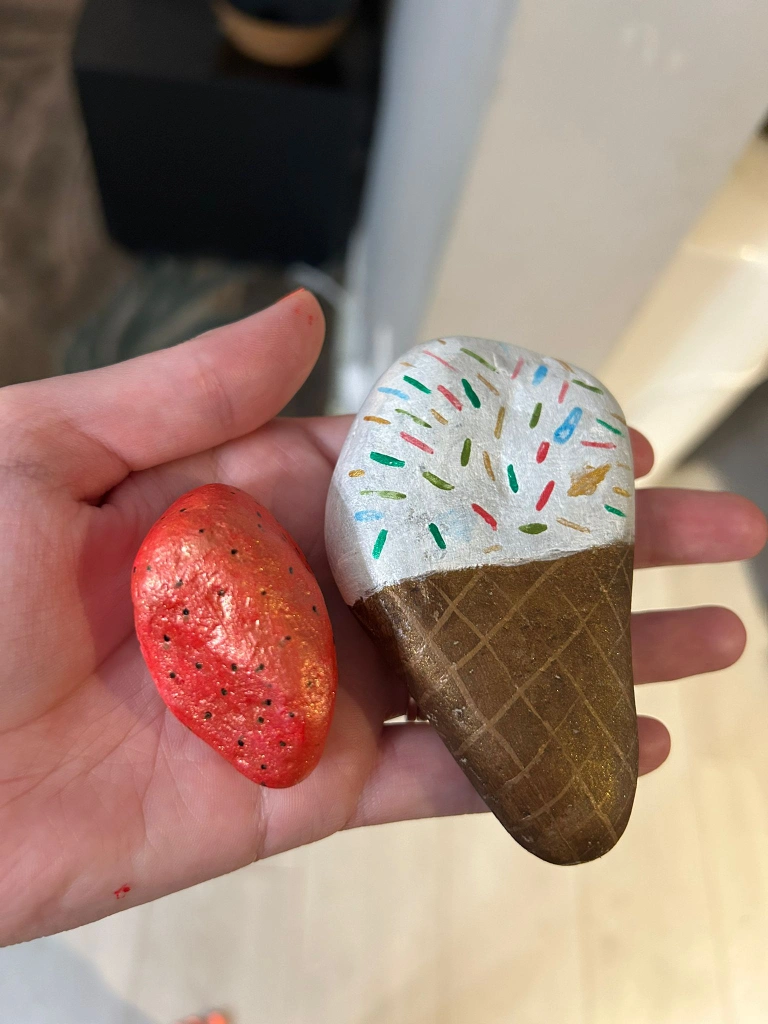 Two cute painted rocks! One looks like a strawberry and the other looks like an ice cream cone. Perfect for decorating a garden or just adding a bit of whimsy to your space