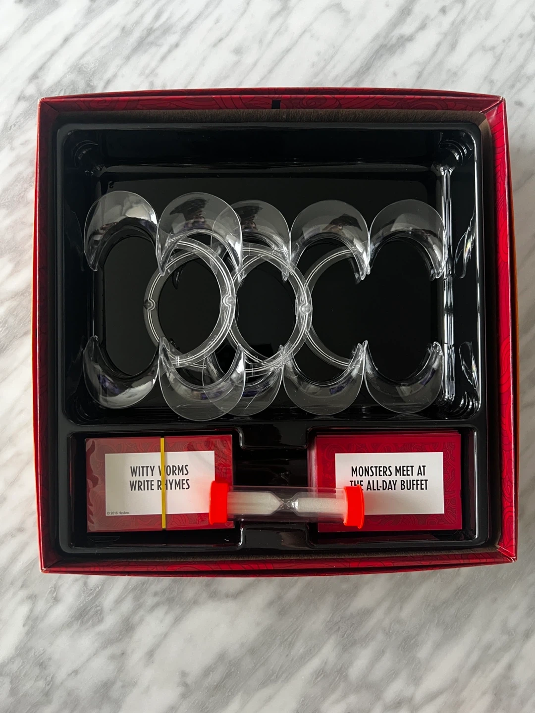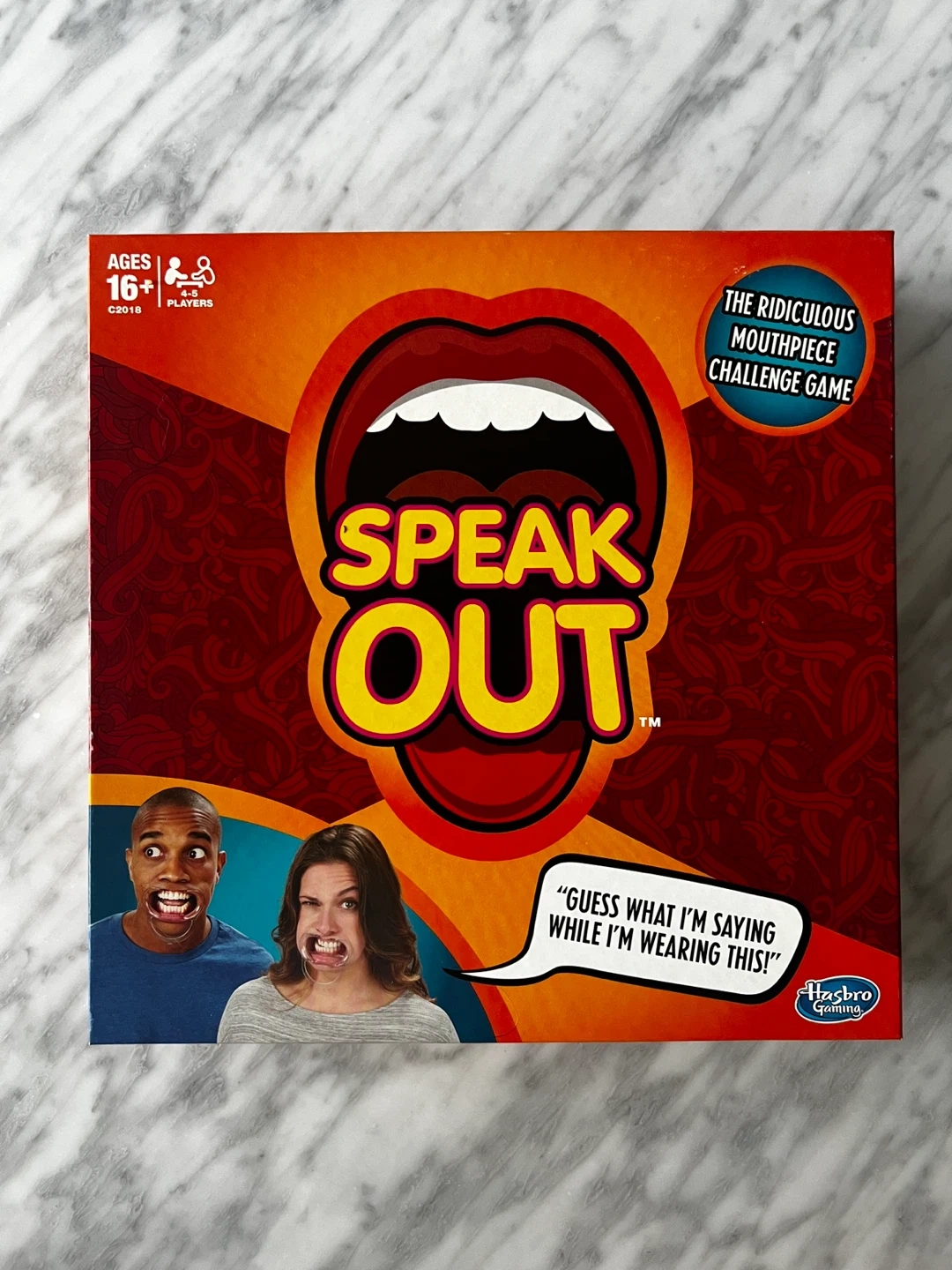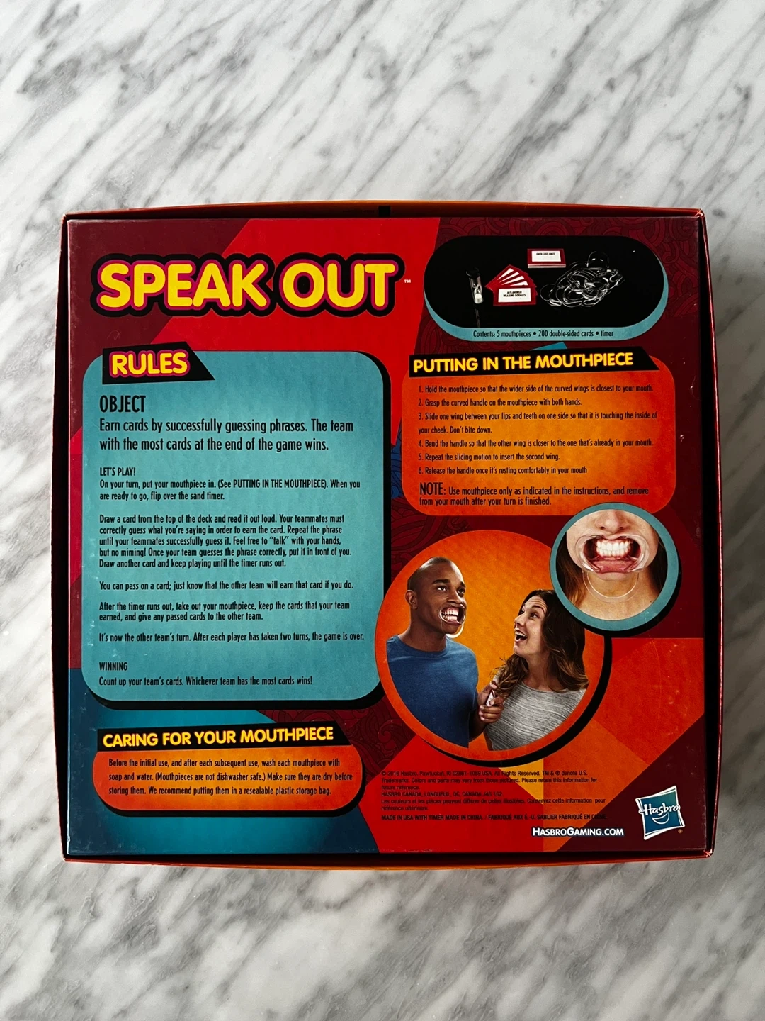 Selling Speak Out game by Hasbro! This hilarious mouthpiece challenge game is perfect for family game nights or parties. It includes everything you need for hours of laughter, with 5 mouthpieces, cards, and timer all in great condition. Get ready to guess what your teammates are saying while wearing the mouthpiece! One pack of cards unopened
