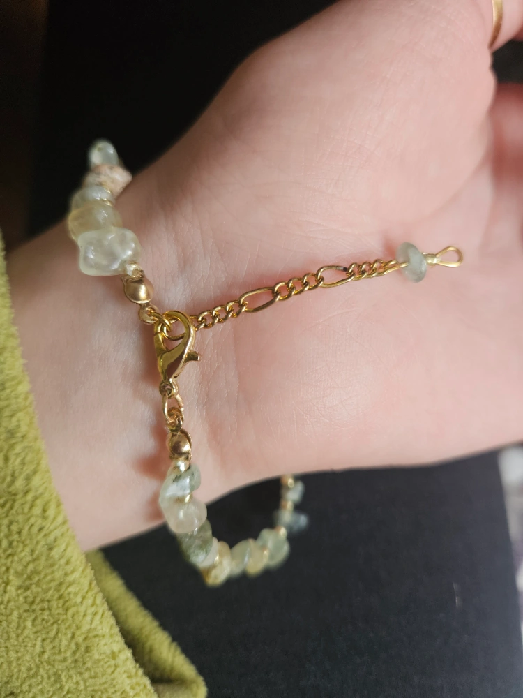 This is a cute handmade bracelet with gemstone chips and gold-tone accents. It has an adjustable chain so you can get the perfect fit!