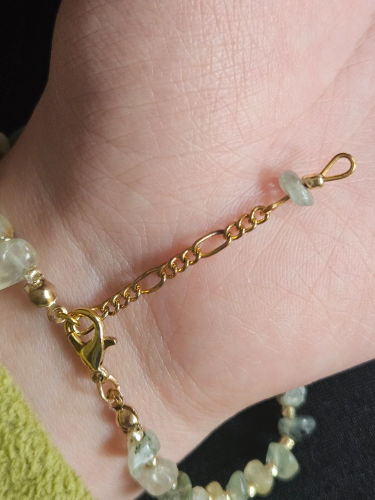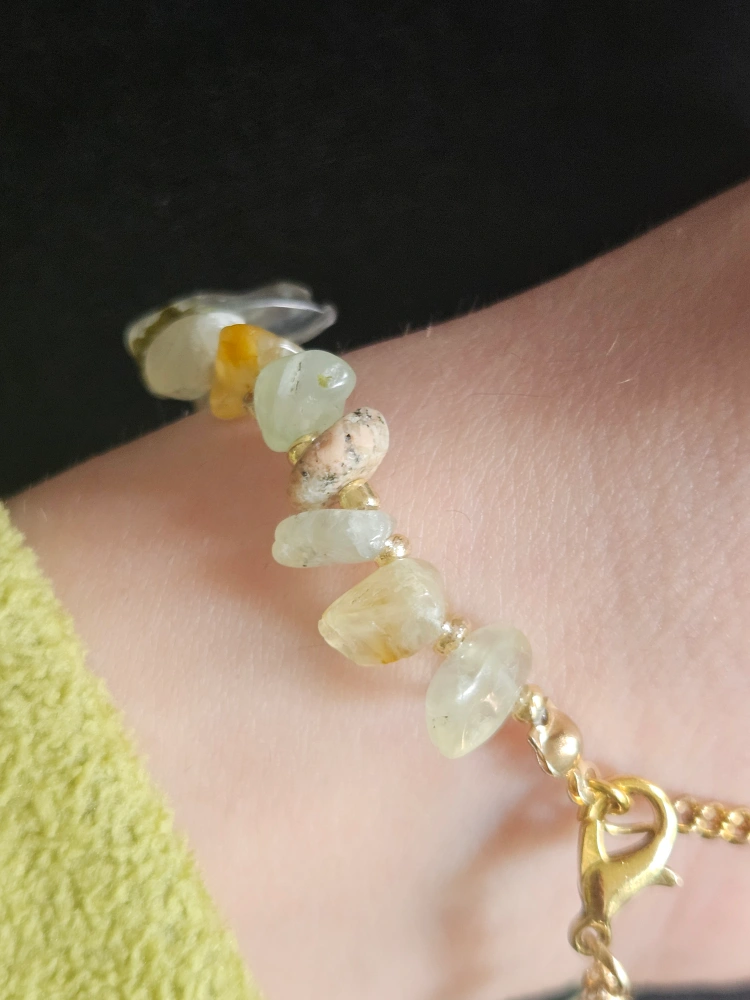 This is a cute handmade bracelet with gemstone chips and gold-tone accents. It has an adjustable chain so you can get the perfect fit!