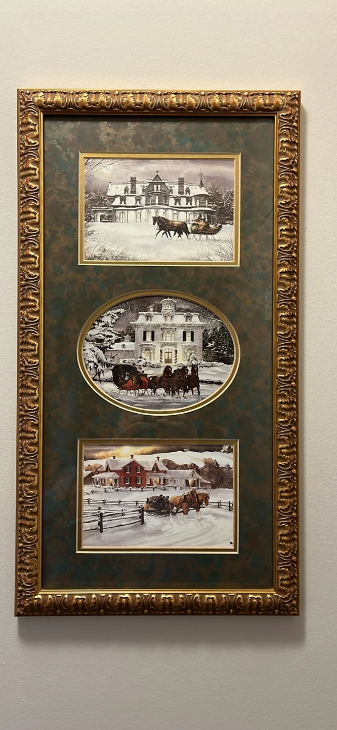 A Lovely framed piece of art featuring Beautiful winter scenes with Horse-drawn Sleighs. The Frame is ornate and gold-toned, adding a touch of elegance to the artwork. It would be a lovely addition to any home!