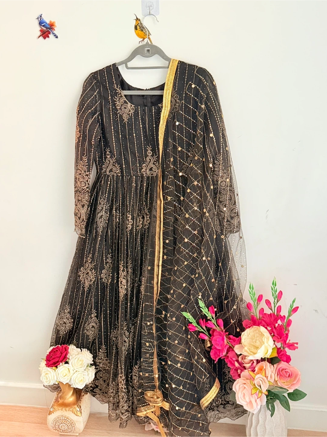 Beautiful black Anarkali dress with gold embroidery. It comes with a matching dupatta. The dress is in great condition and perfect for special occasions!