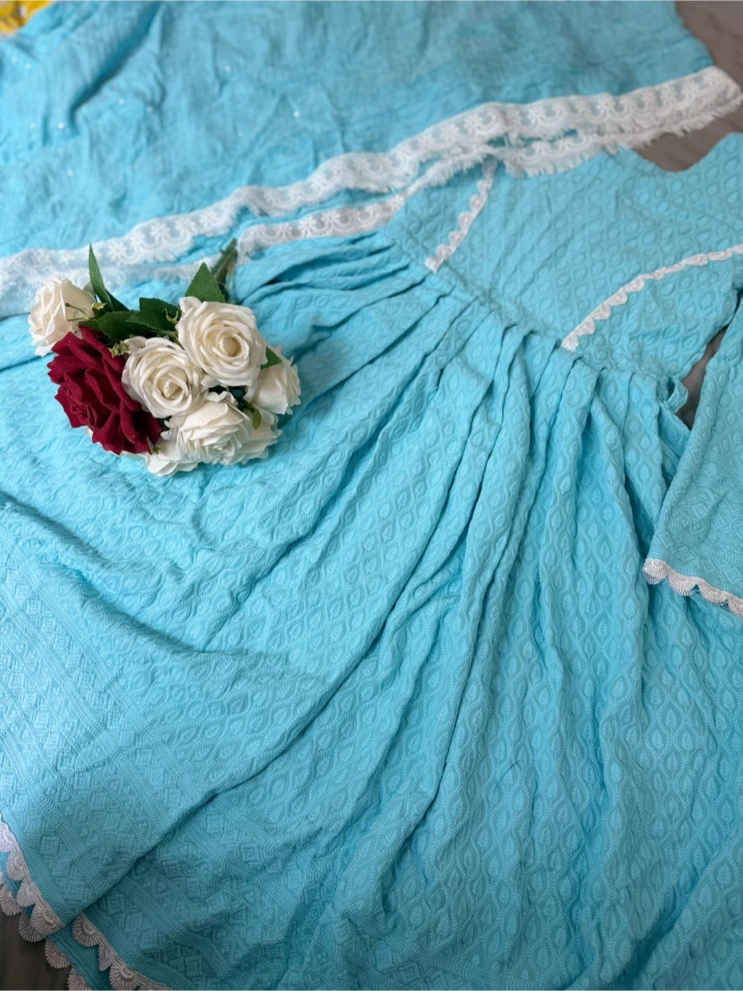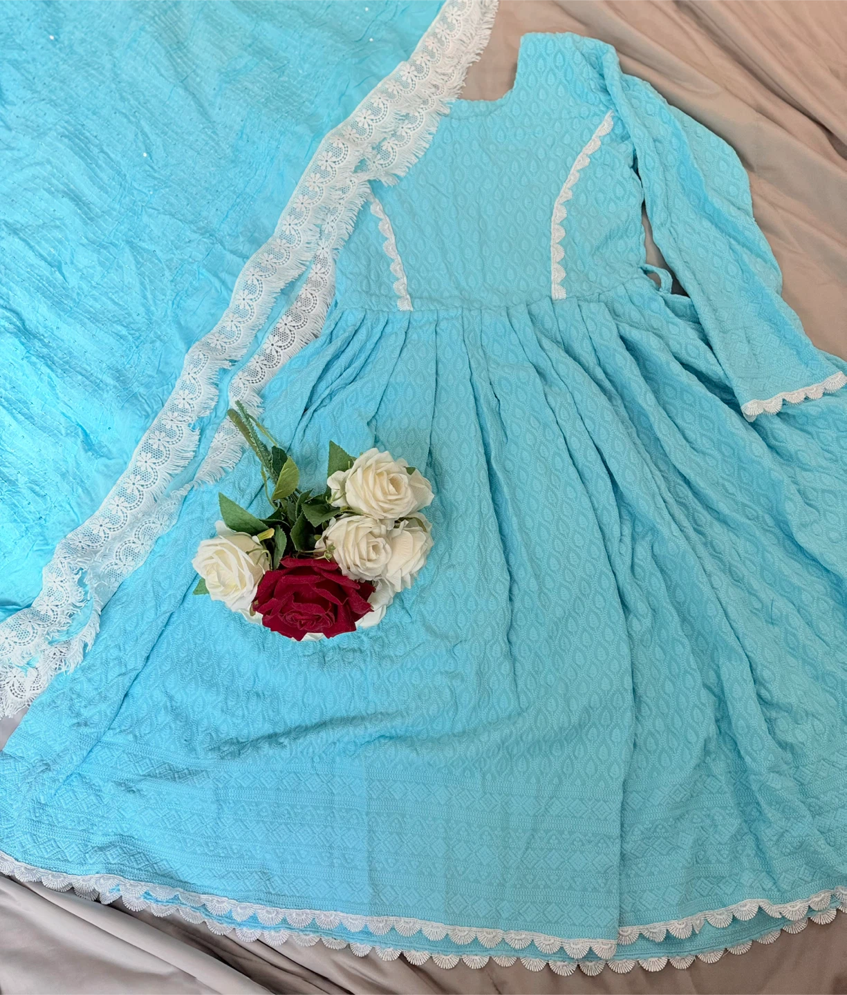 Beautiful blue dress with delicate white lace detailing! It's in great condition and ready for a new home. The dress features a lovely texture and a classic design, perfect for any occasion