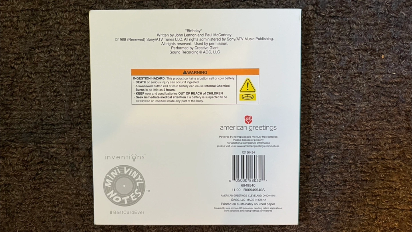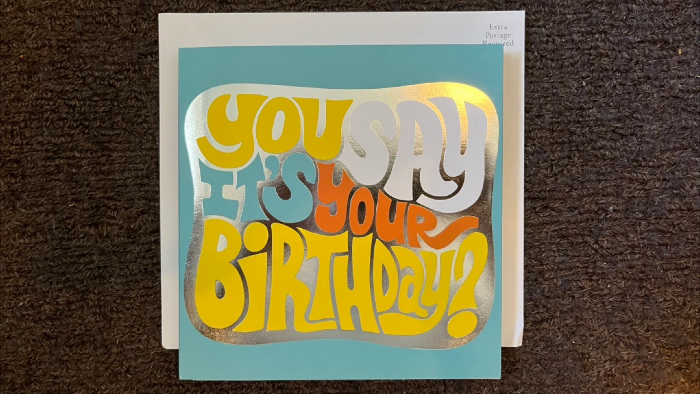A brand new card with The Beatles 1968 hit “Birthday” that plays when the card is opened. Not only does the record spin but the tonearm moves. Envelope included and has a pocket for cash or what have you.