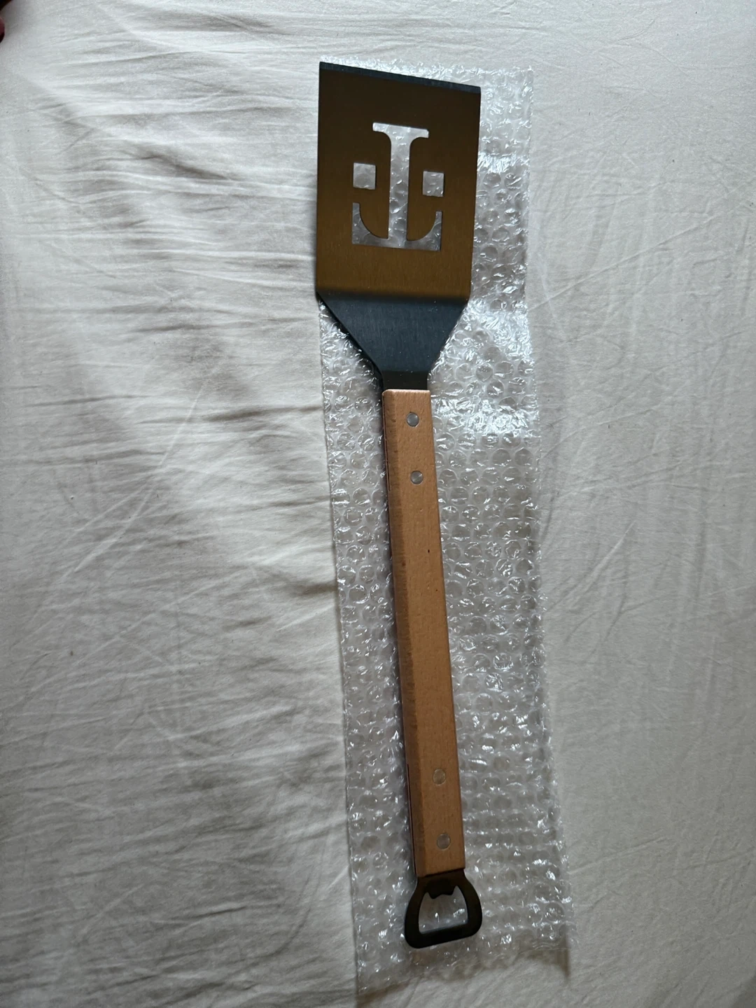 Tennessee Volunteers BBQ spatula. It features the iconic 'T' logo cut out of the stainless steel spatula head and has a wooden handle with a bottle opener at the end. It measures approximately 17 inches in length. Perfect for grilling and tailgating.