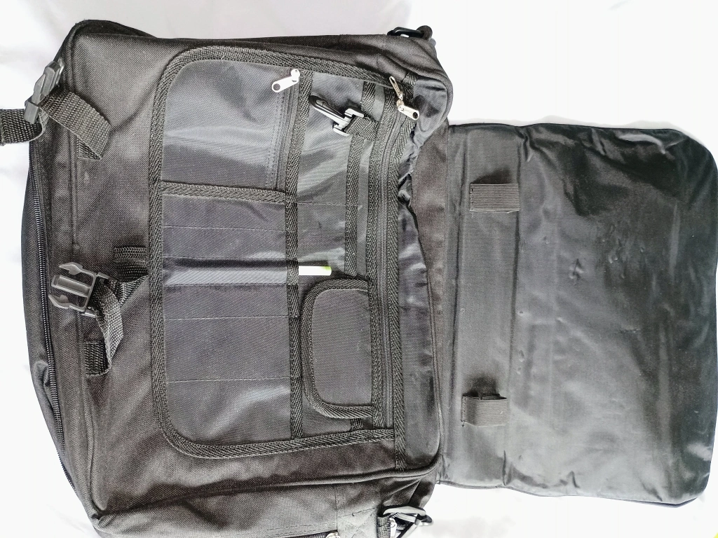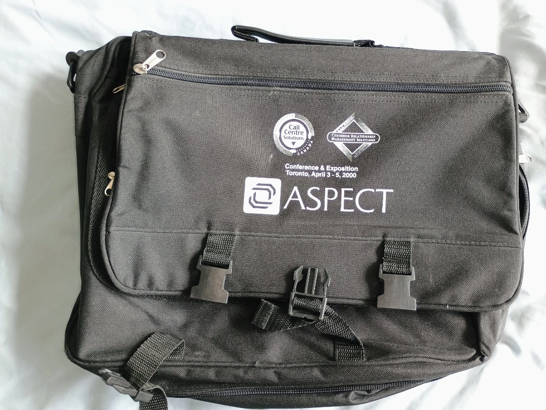 Selling a black conference bag with the Aspect logo. It has lots of compartments inside for organizing your things. Great for carrying your laptop and other essentials to meetings or conferences. It's in good condition and ready for a new owner