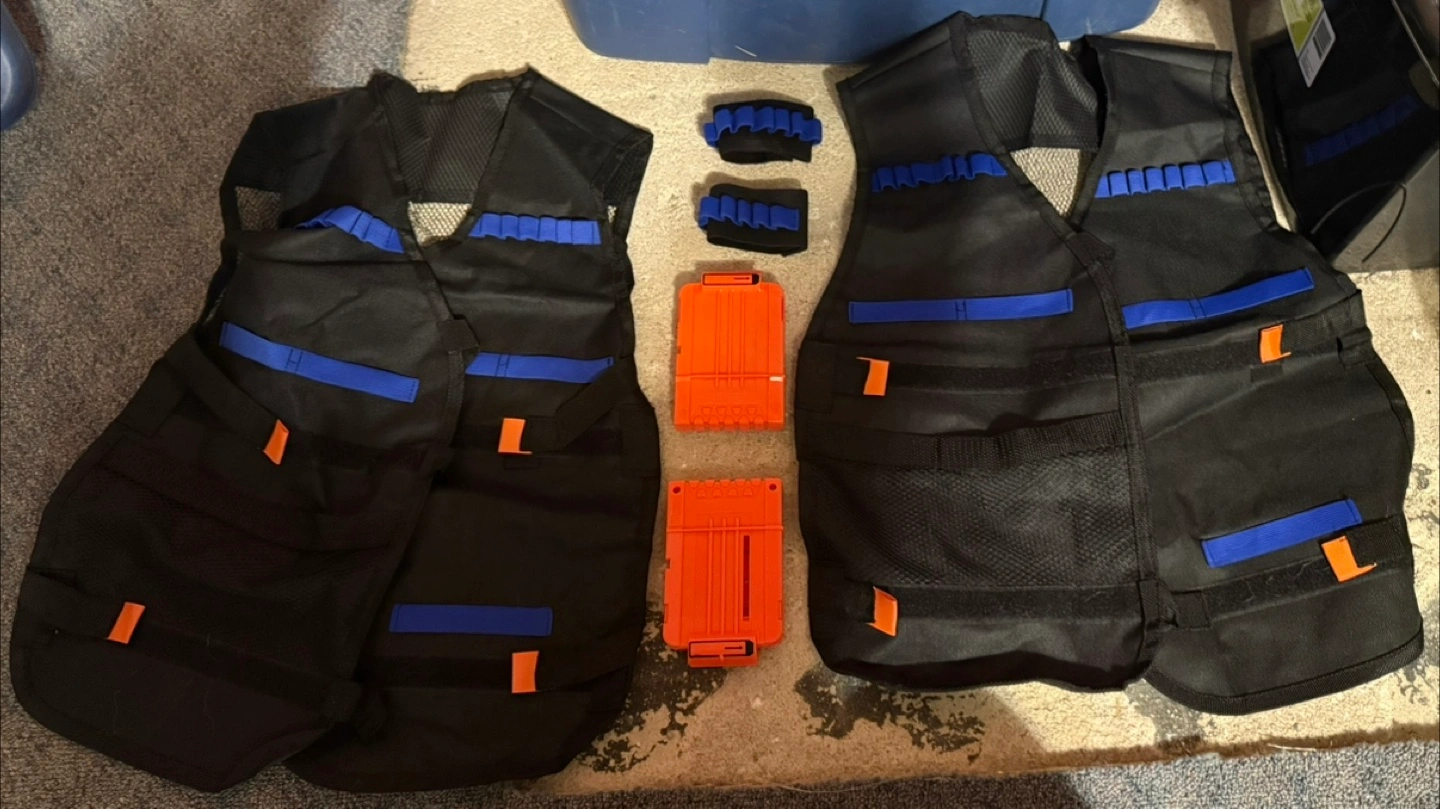 41Selling a pair of Nerf tactical vests with accessories. They're in great shape and ready for your next Nerf battle! Includes extra clips and wristbands for darts Like new, only worn once or twice.