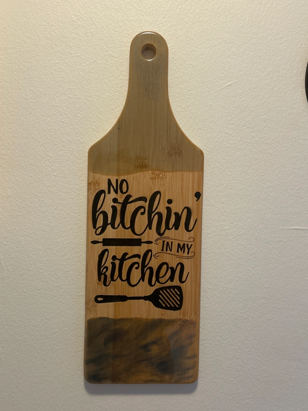 This is a wooden cutting board with the saying "No bitchin' in my kitchen" written on it. Covered by resin on top and at the bottom. It's a fun piece to add to your kitchen decor!
