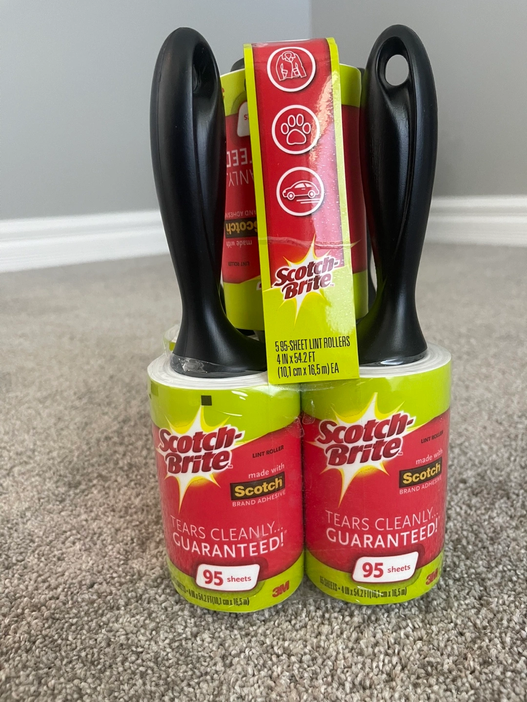 JUST REDUCED - now 18.00 for ALL 5 pieces. Selling a 5-pack of Scotch-Brite lint rollers. Each roller has 95 sheets, and the pack includes 5 rollers. They're great for removing lint from clothing, pet hair, and even cleaning car interiors. Tears cleanly !