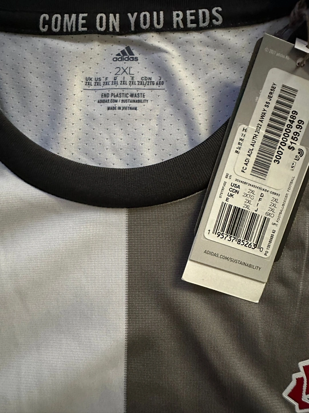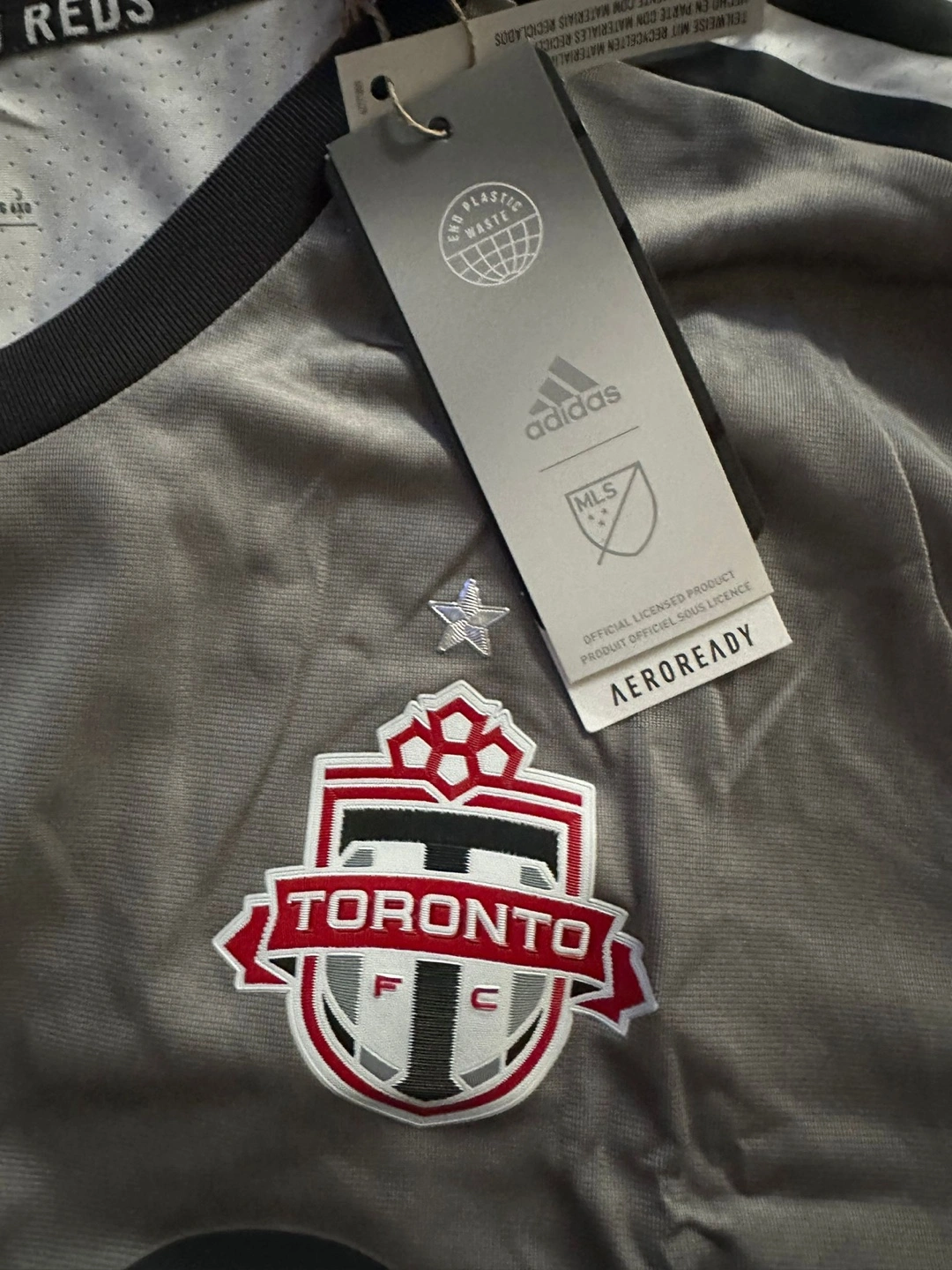 73Selling a brand new with tags Adidas Toronto FC Away Jersey in size 2XL. It's a stylish grey and white design. Originally bought for $159.99, this jersey is made with end plastic waste and features AEROREADY technology for comfort. Perfect for any Toronto FC fan!