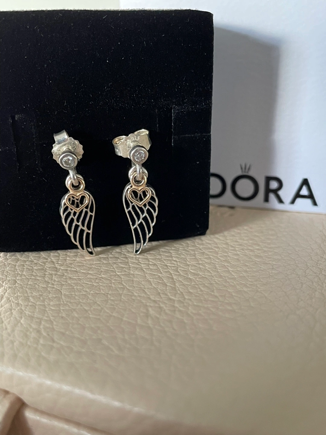 Selling a pair of Pandora earrings featuring a wing and heart dangle design! These are in great condition and come with the original box