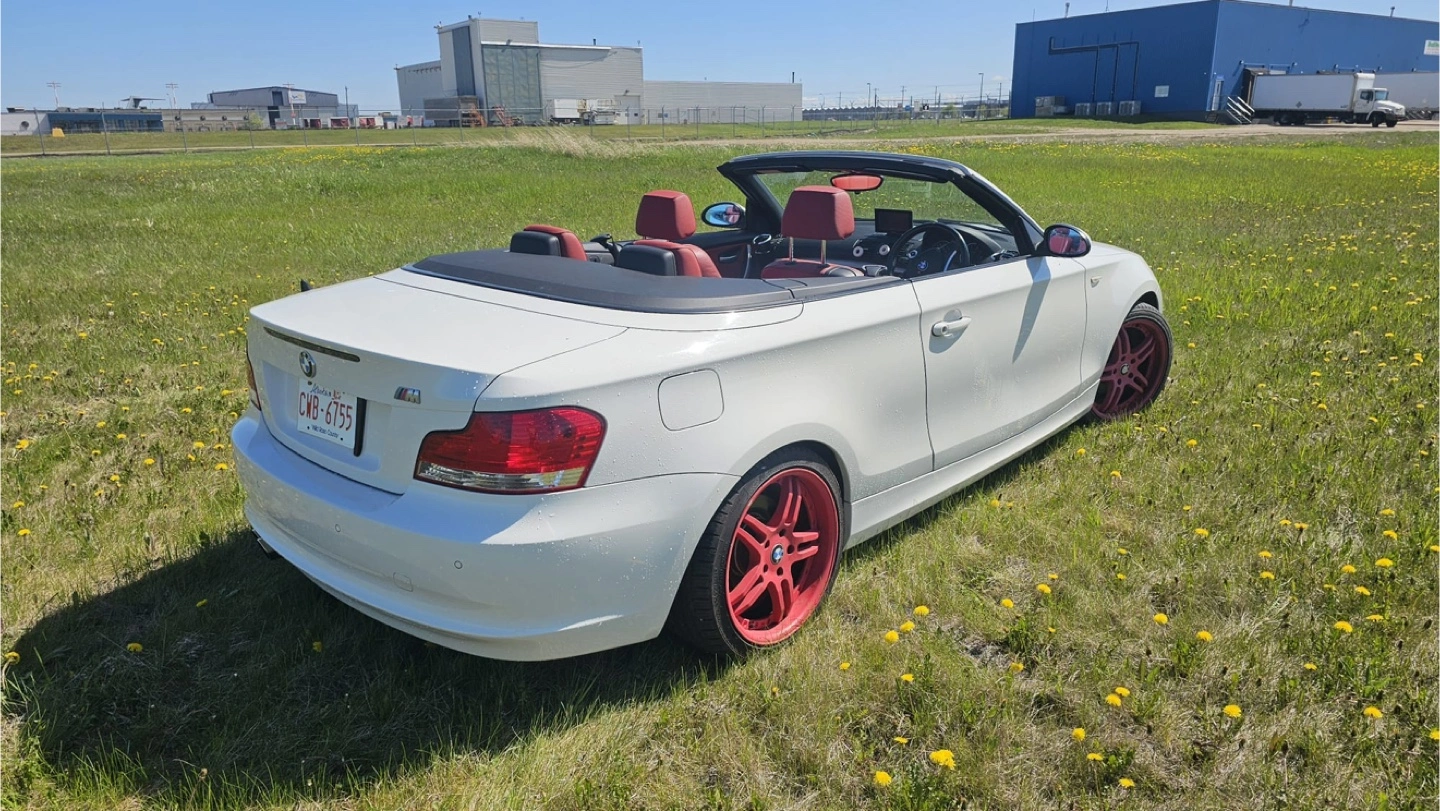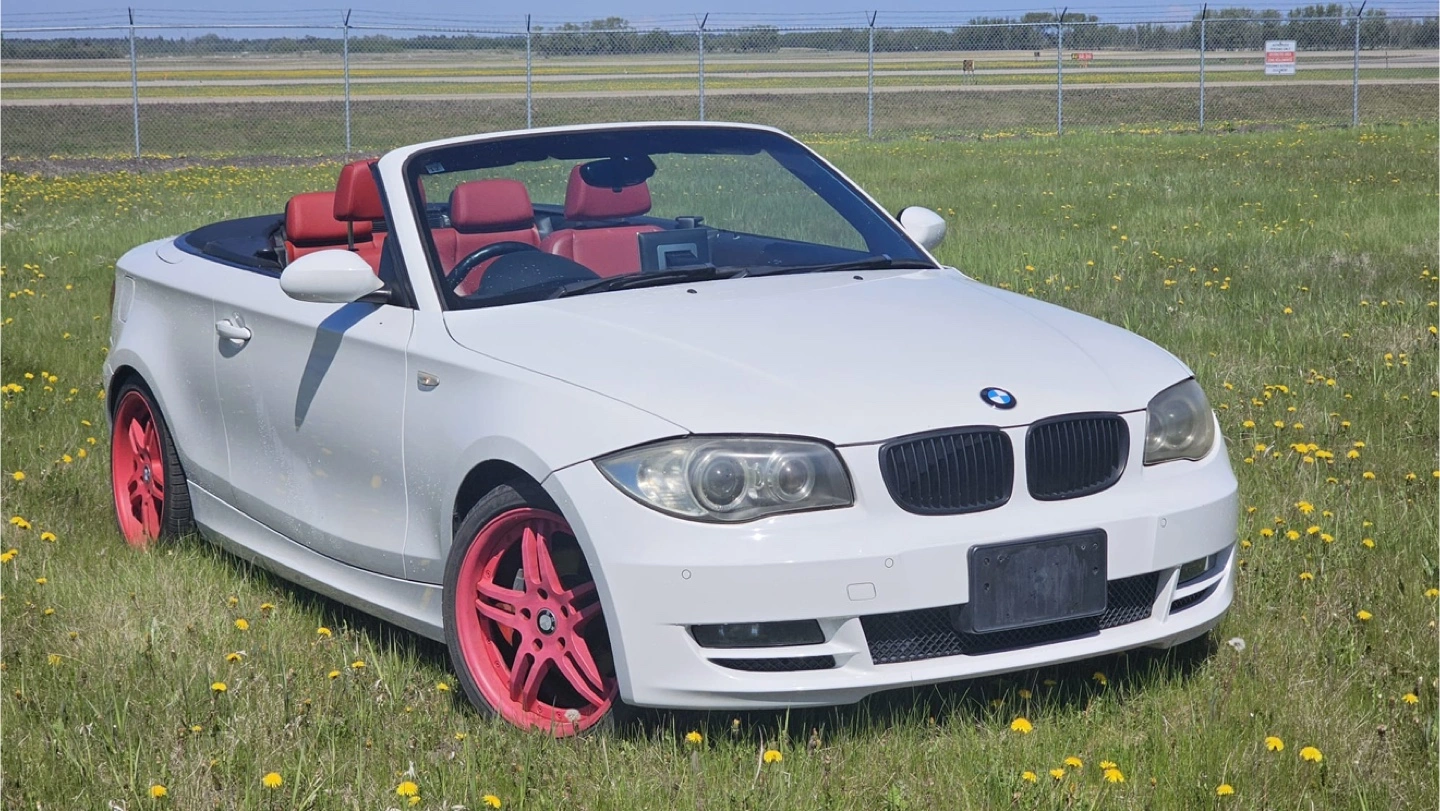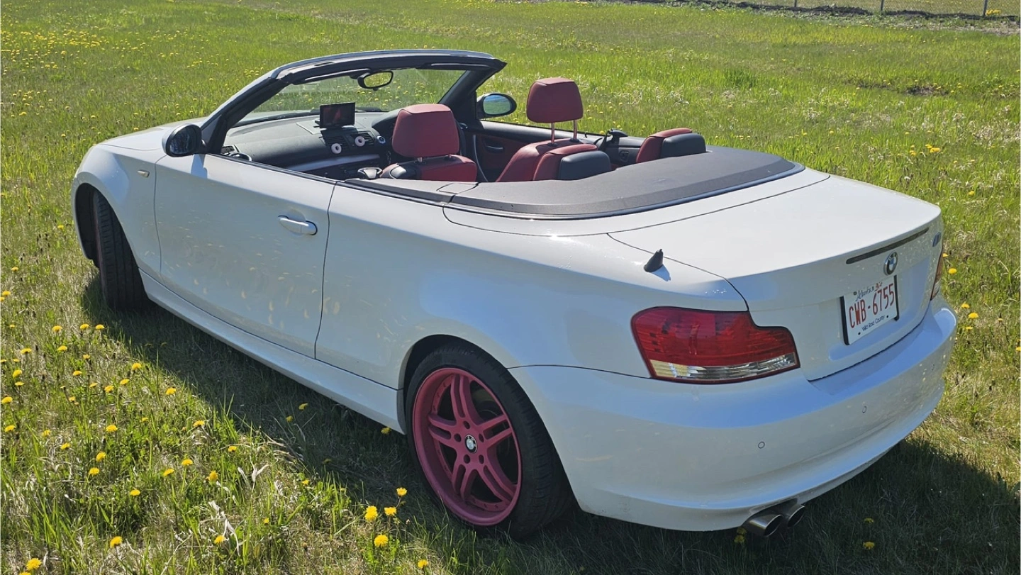 Selling a BMW 1 Series Convertible in white with red interior. It's in good condition with very low kms only 70,000 and ready for drive.